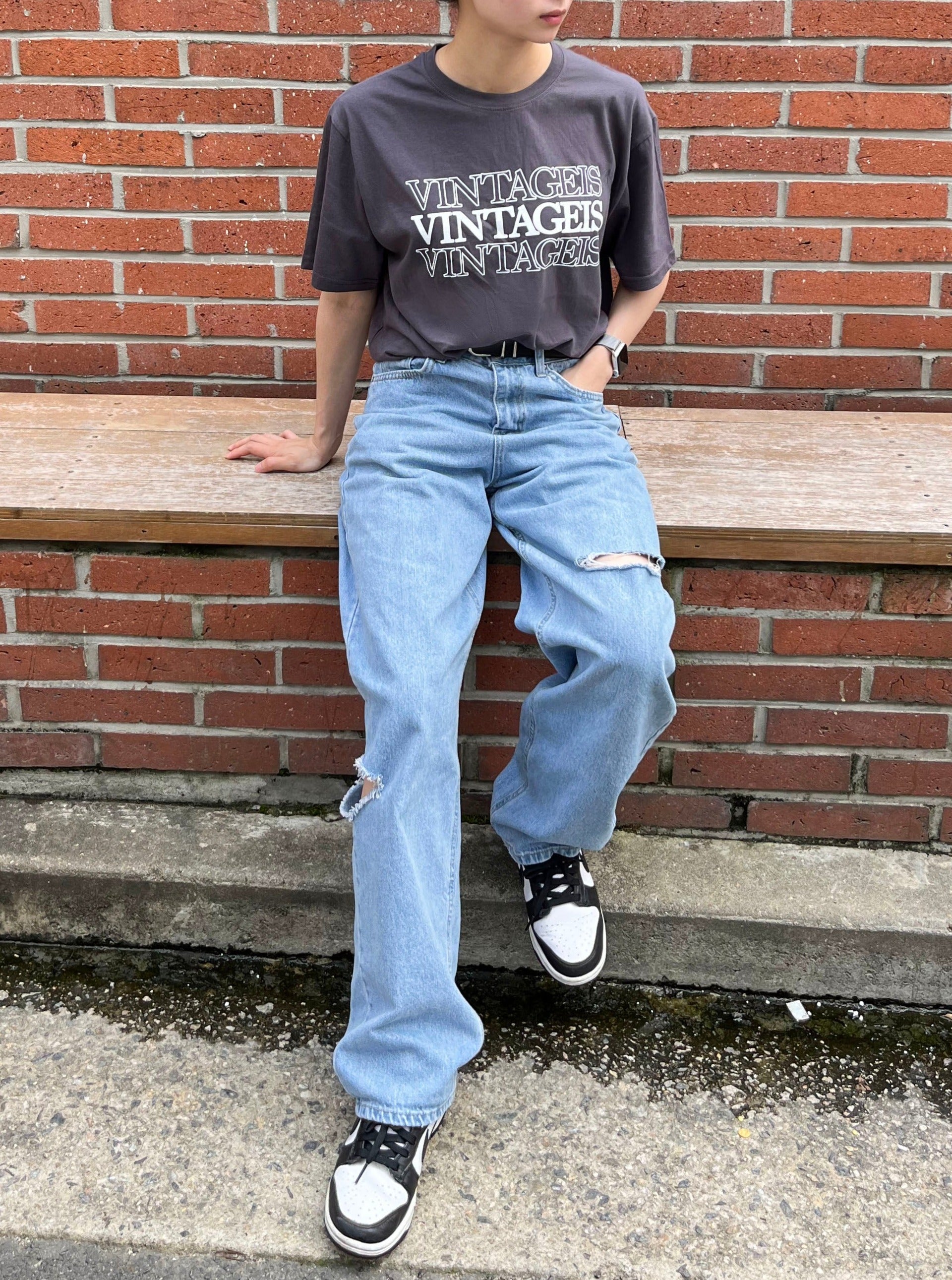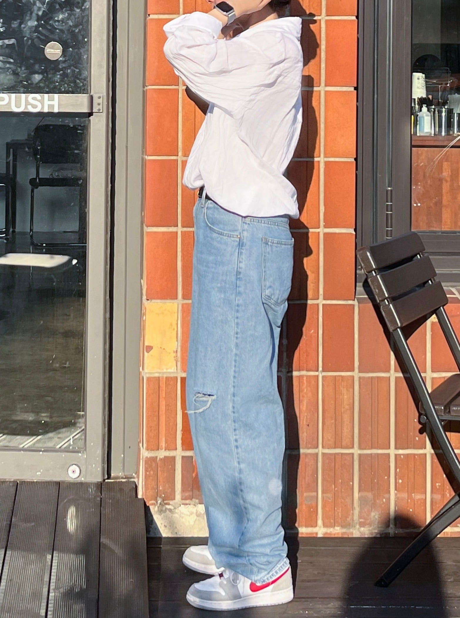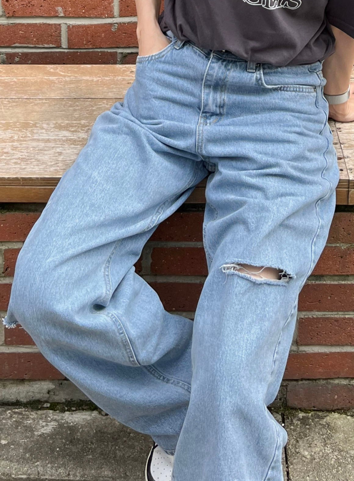 This baggy jean is featured in a high-rise with straight-out silhouette.