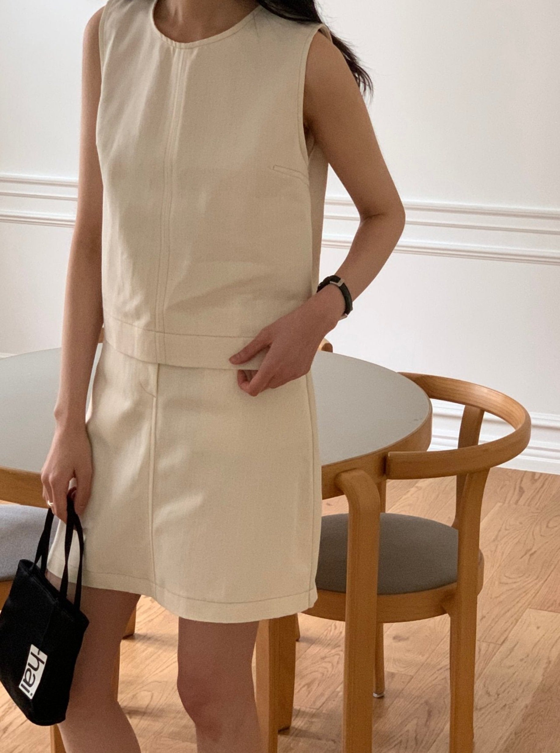 Round neck, Sleeveless, Back zipper, Stitch detail, Non-fade denim fabric