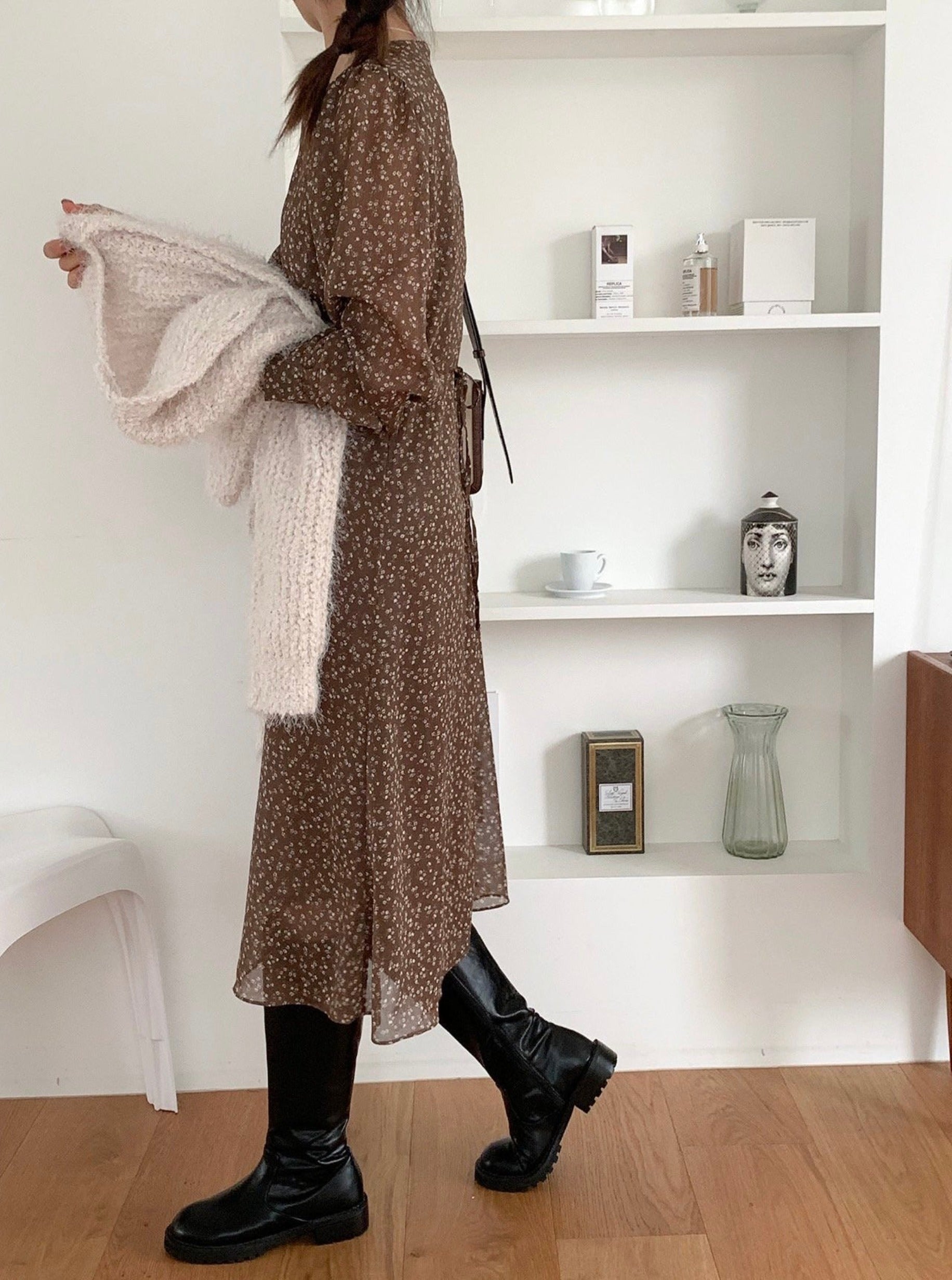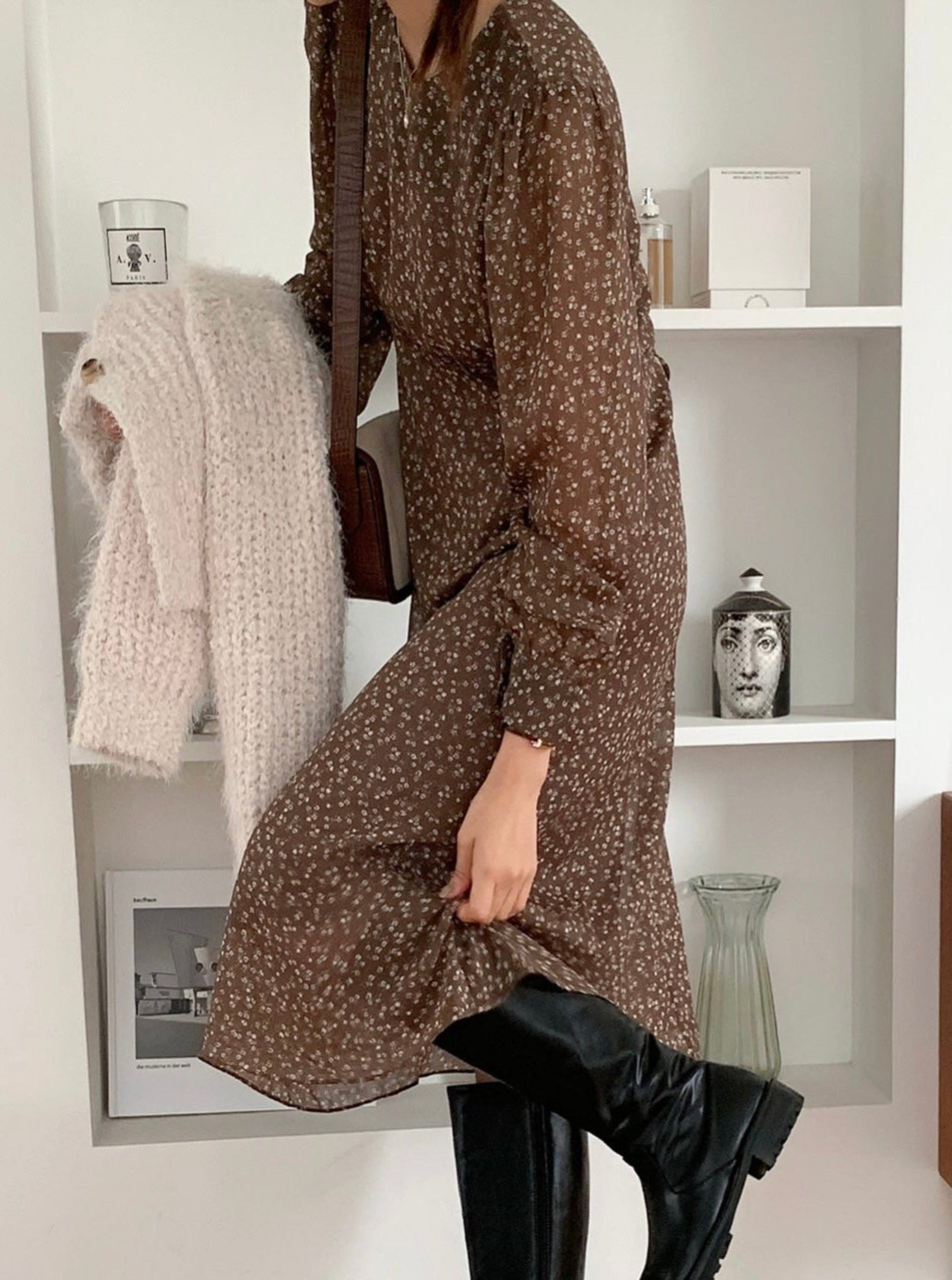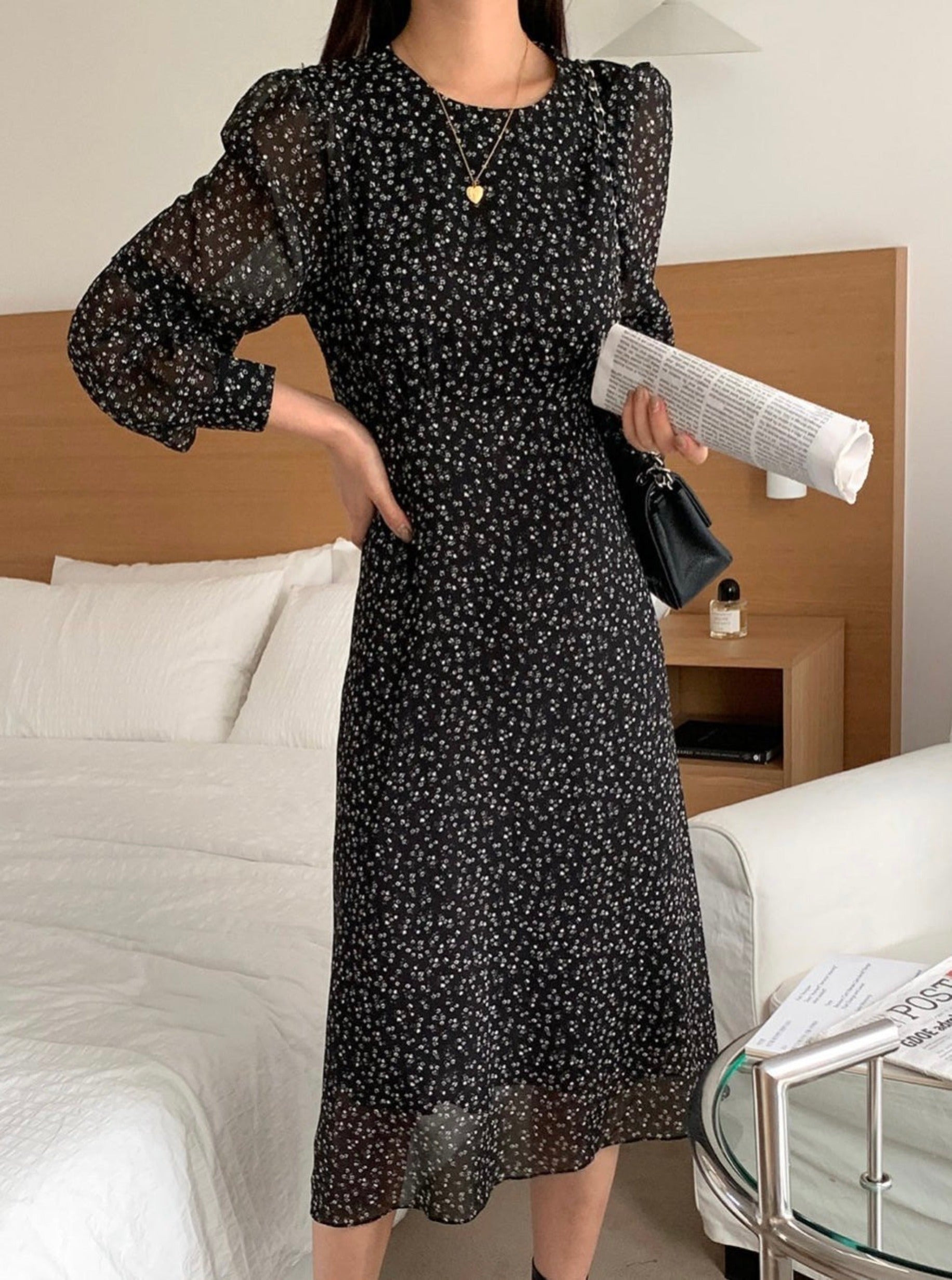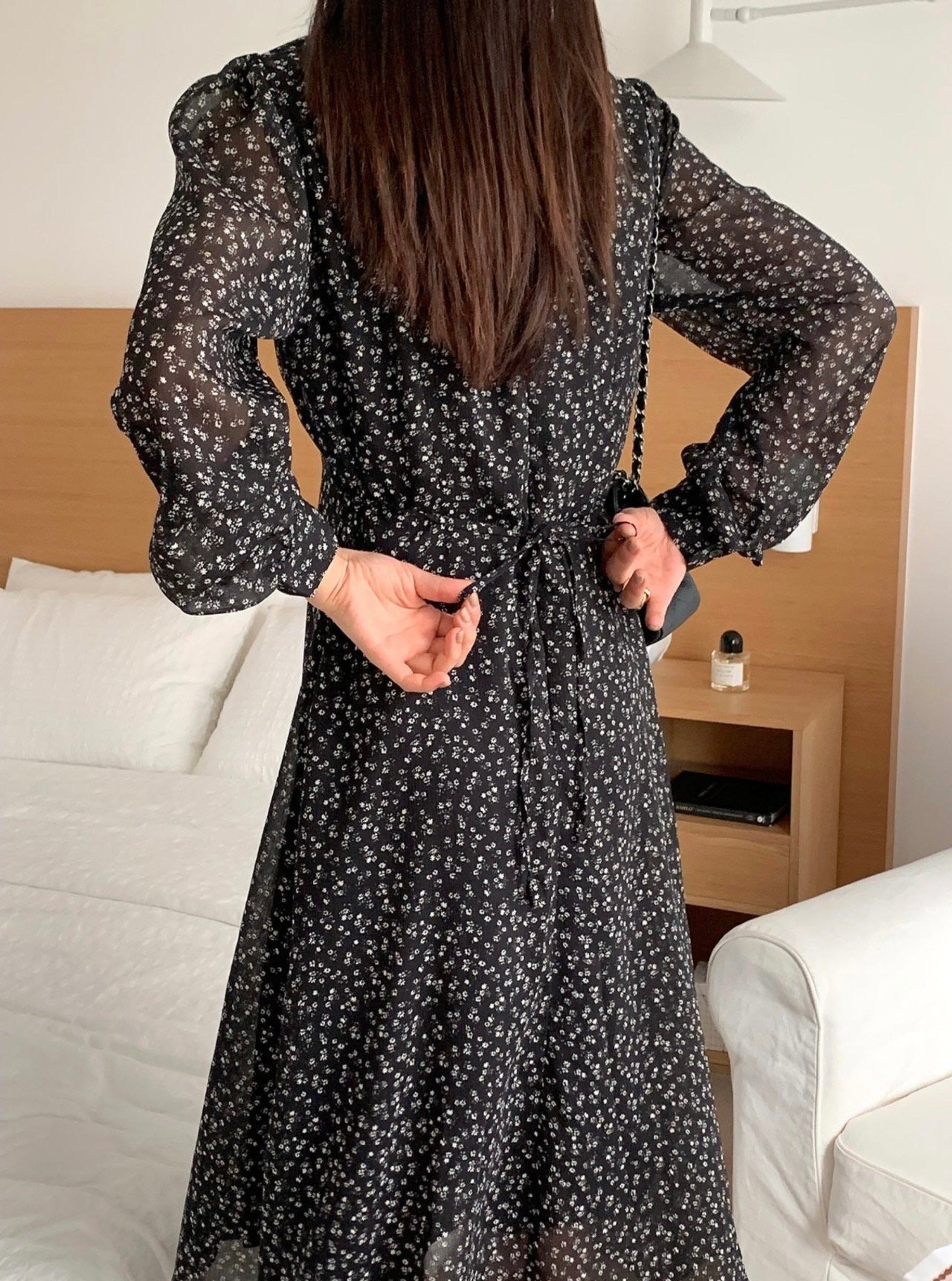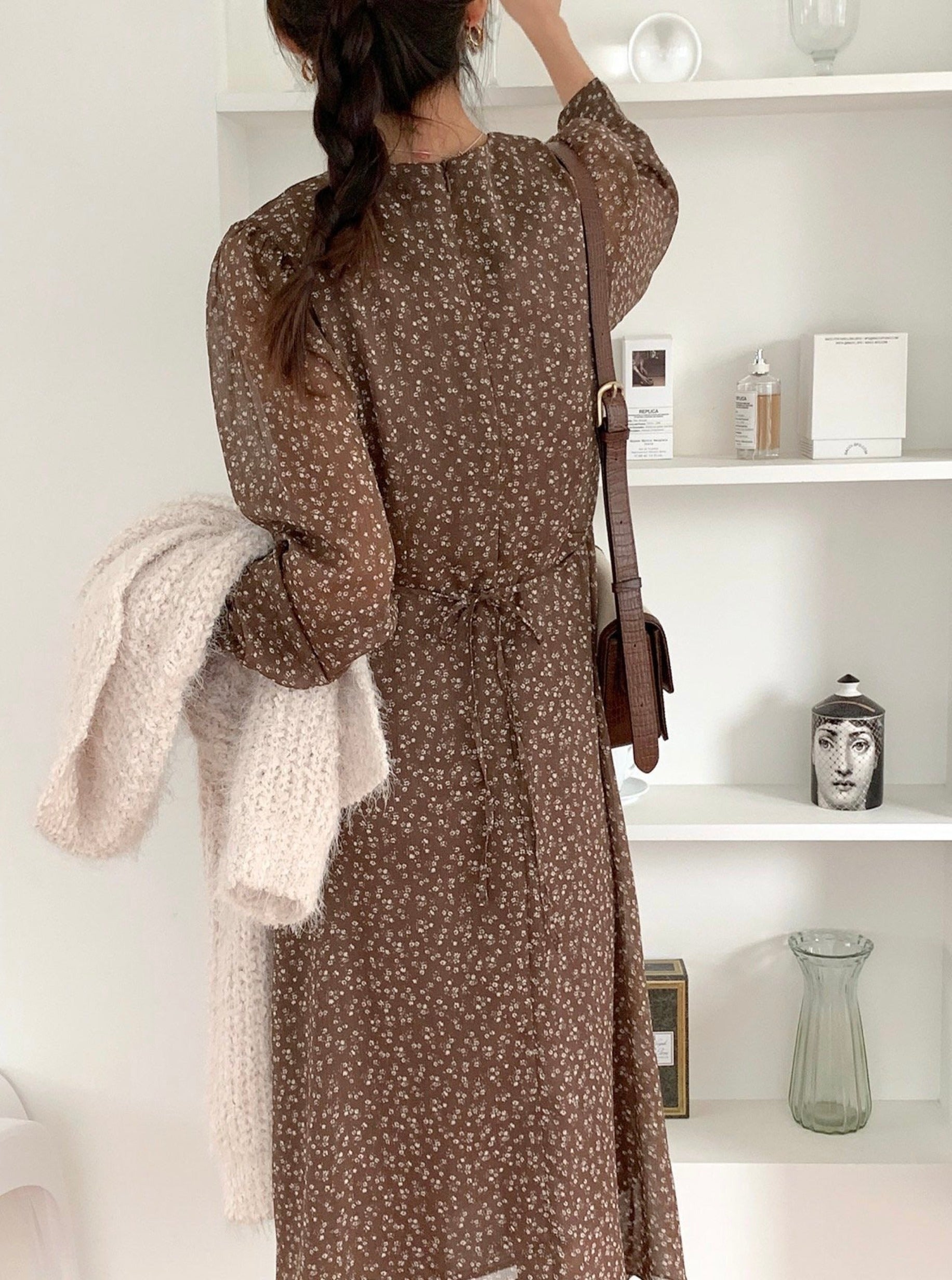 This romantic midi dress is featured in a round neck, long sleeve with back tie.