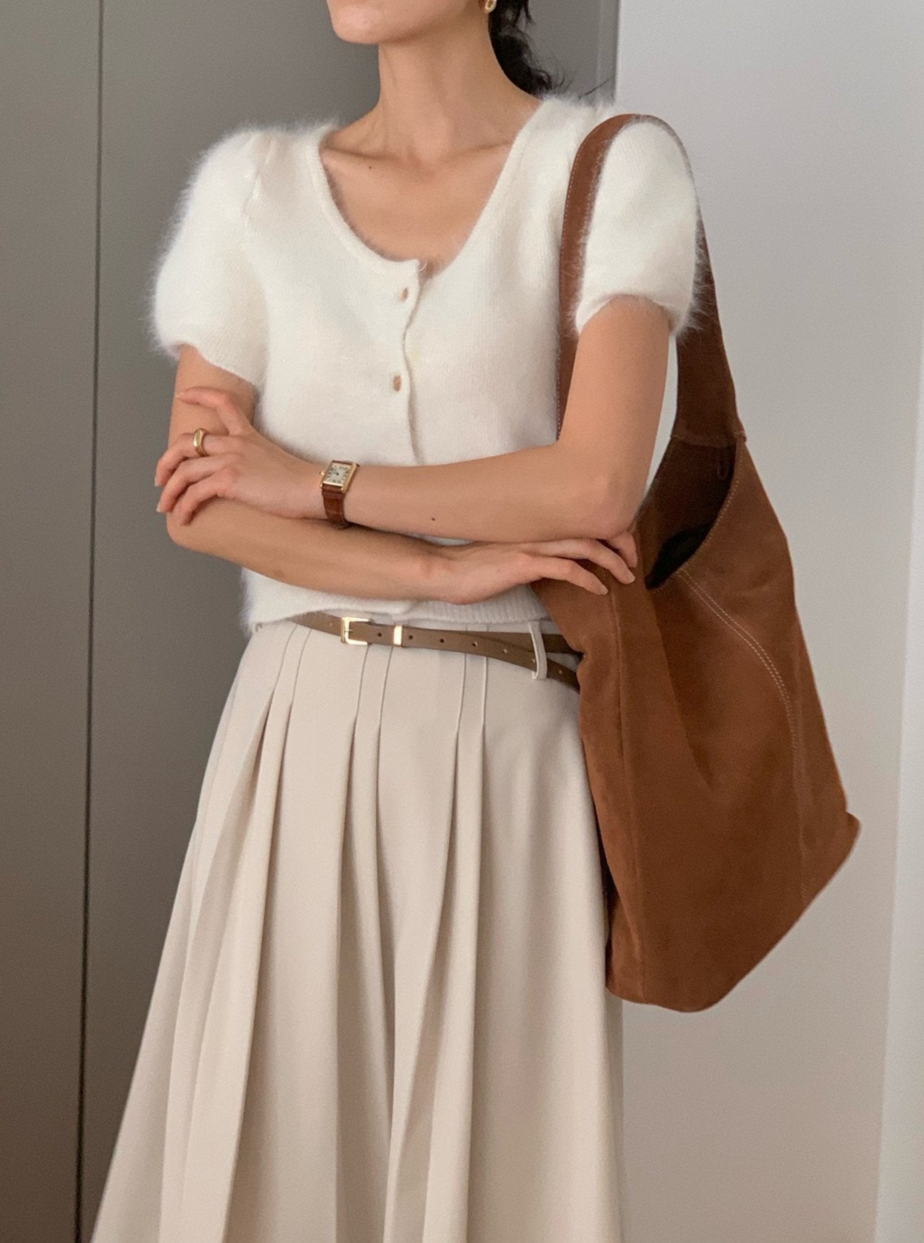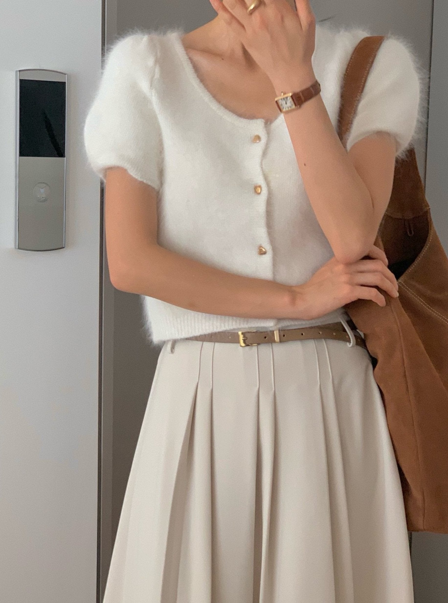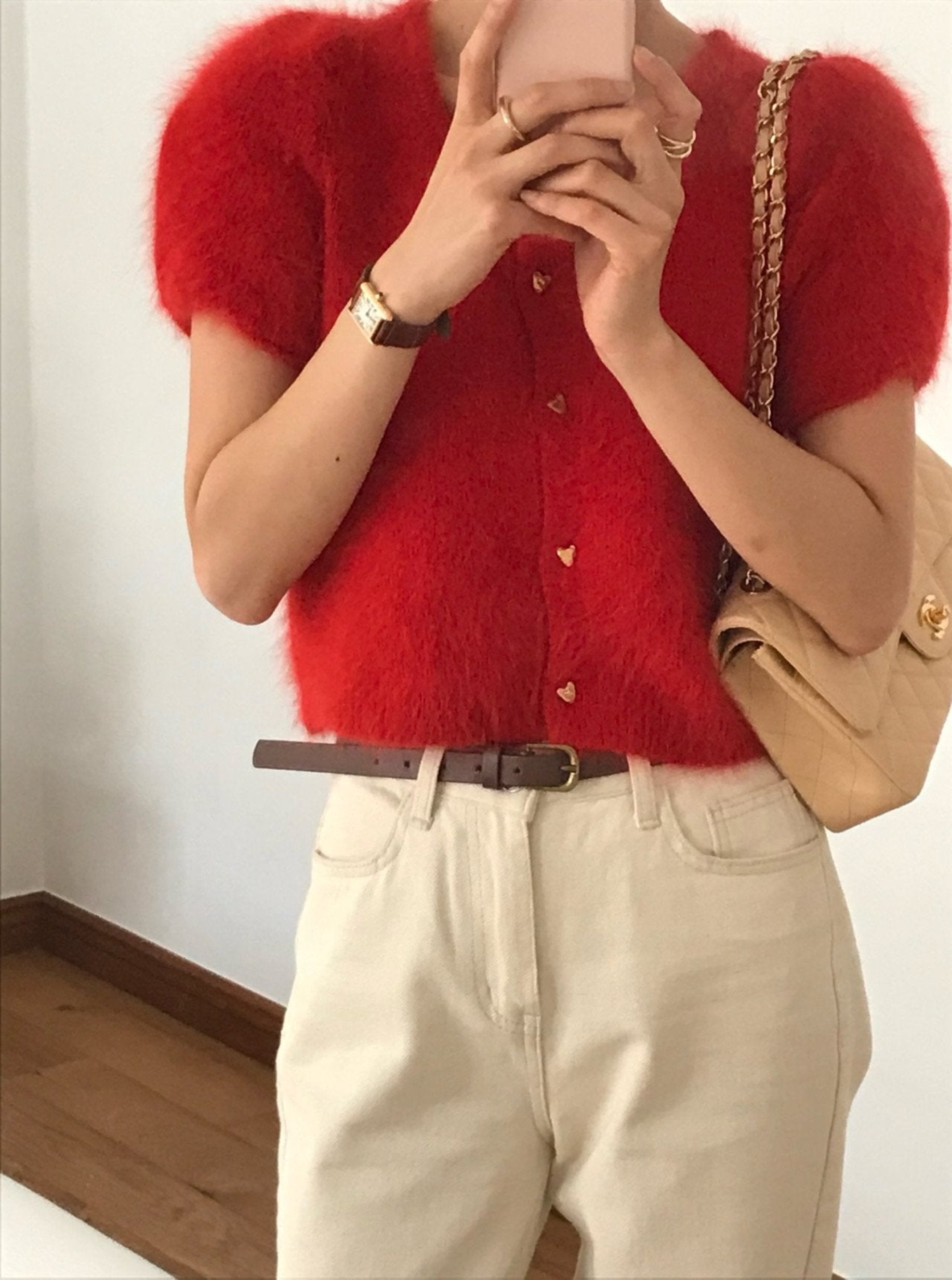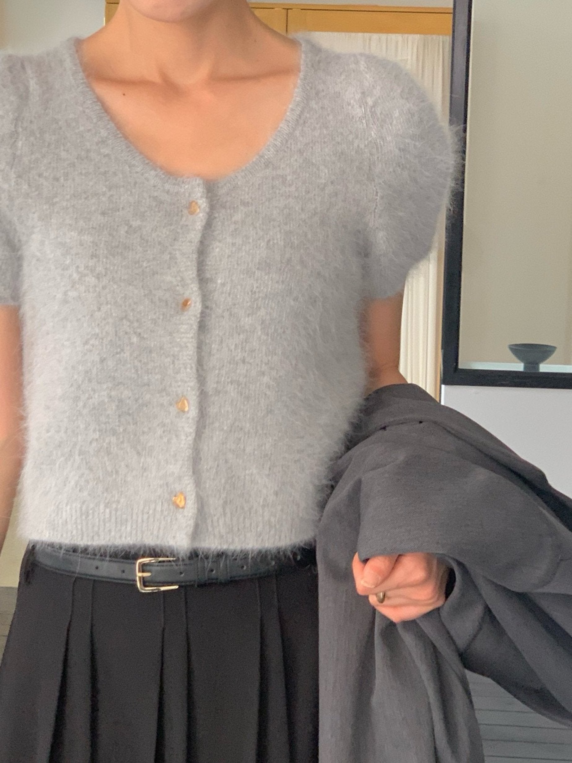 Soft and cozy fabric makes warm and comfy. Featuring puff short sleeve, heart- shaped metal heart buttons.