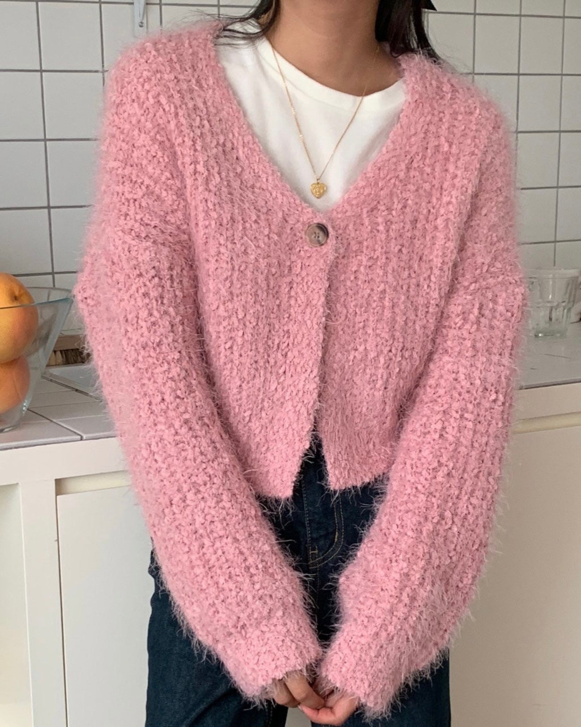 This cardigan is featured in a v-neck with one button.