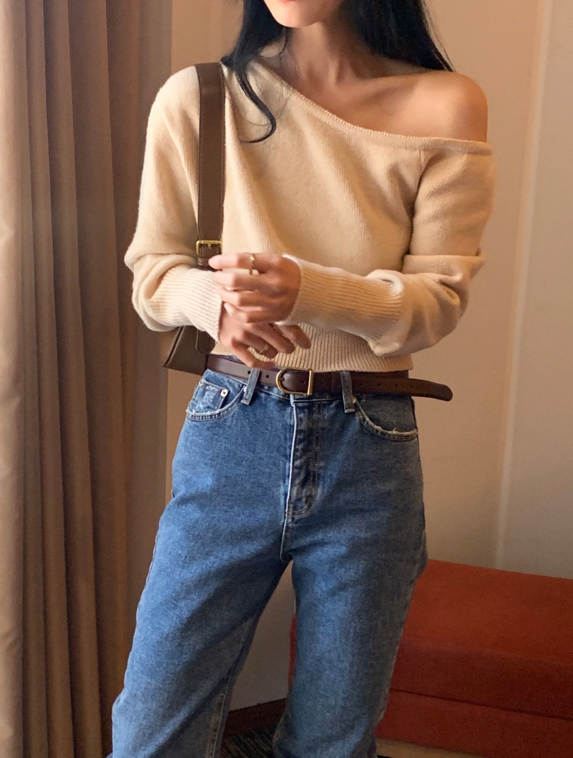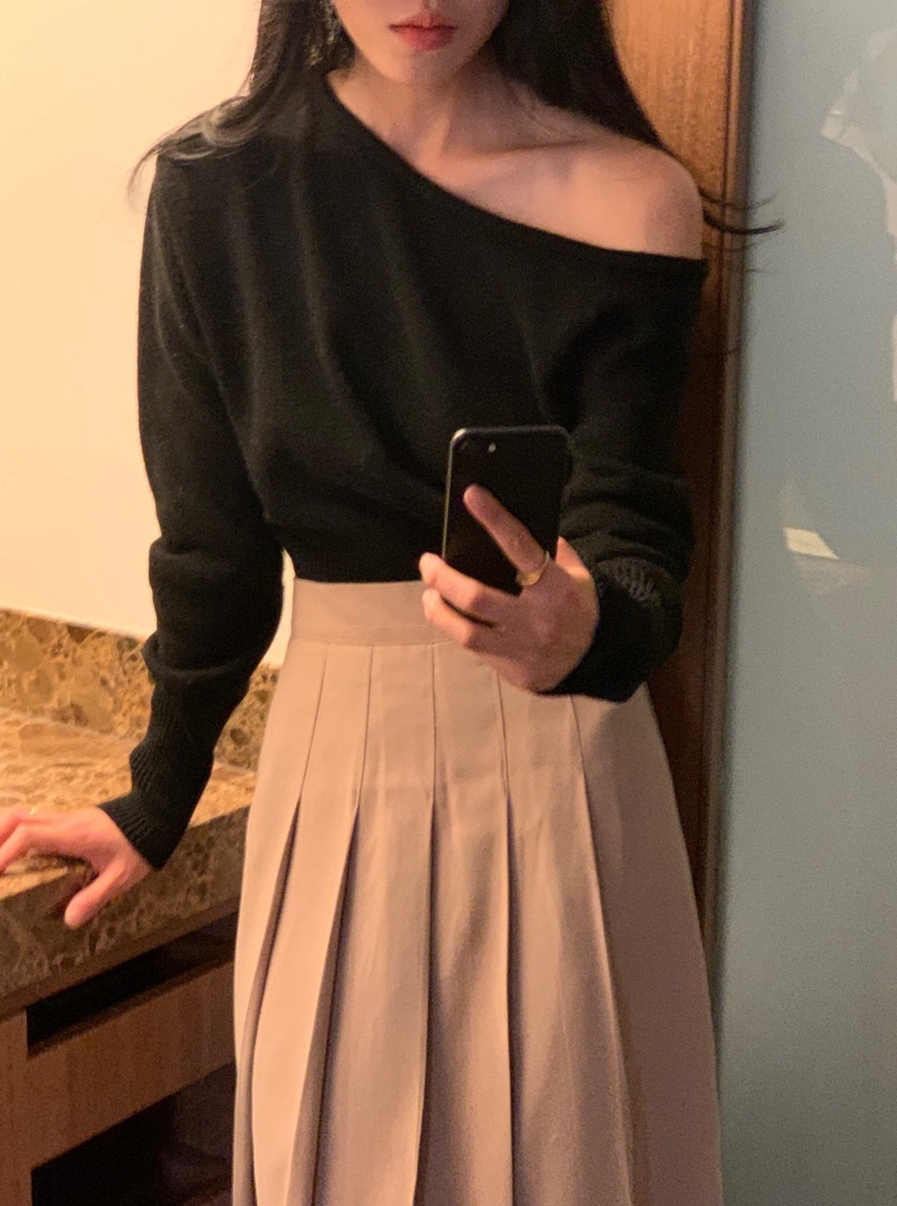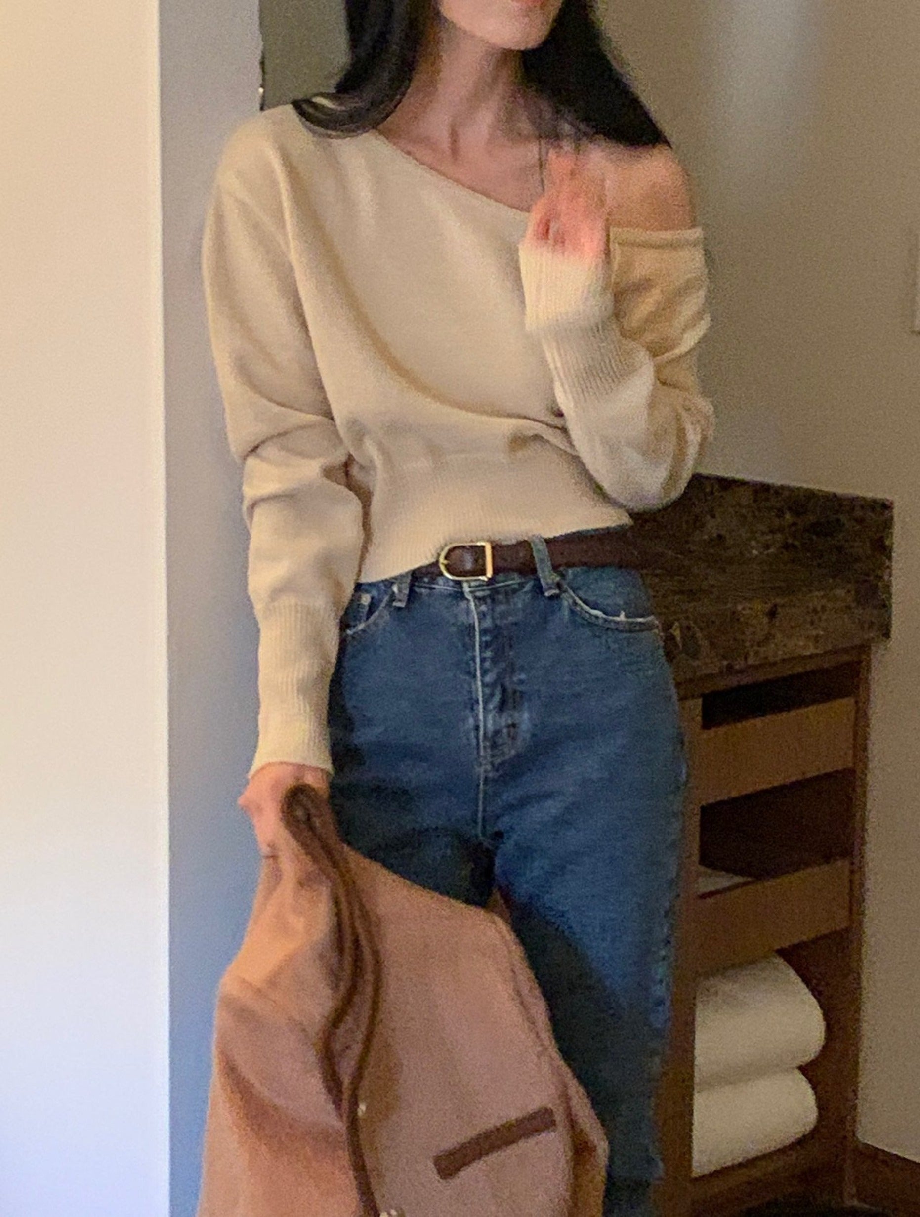 Relaxed fit, Boat neck , One shoulder, Long sleeve, Cozy and warm fabric