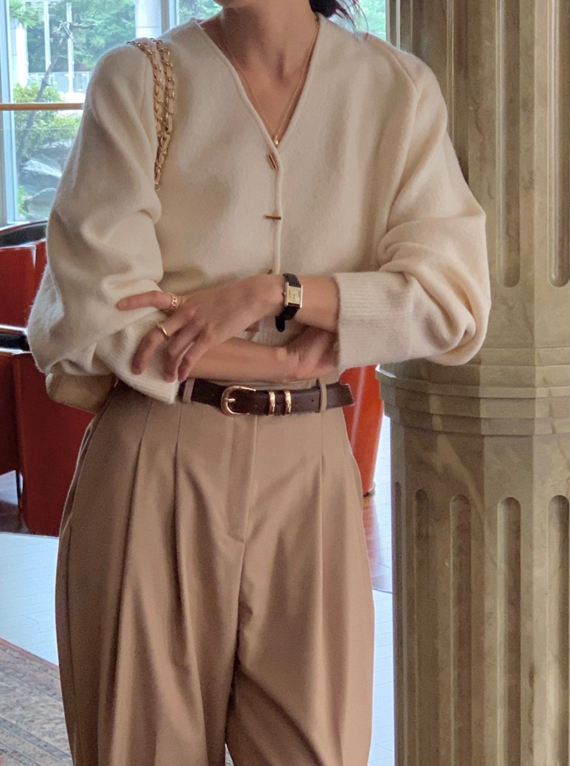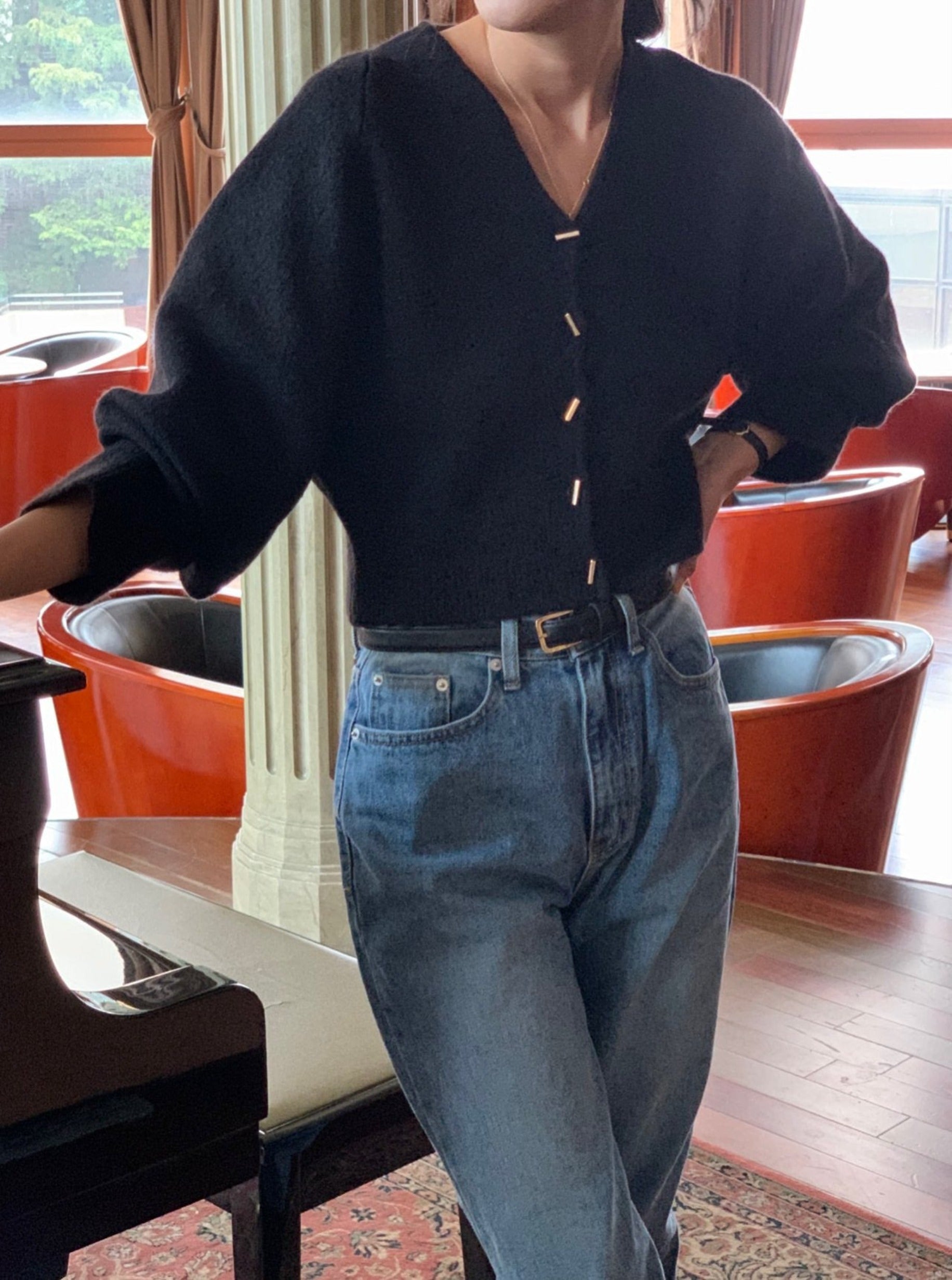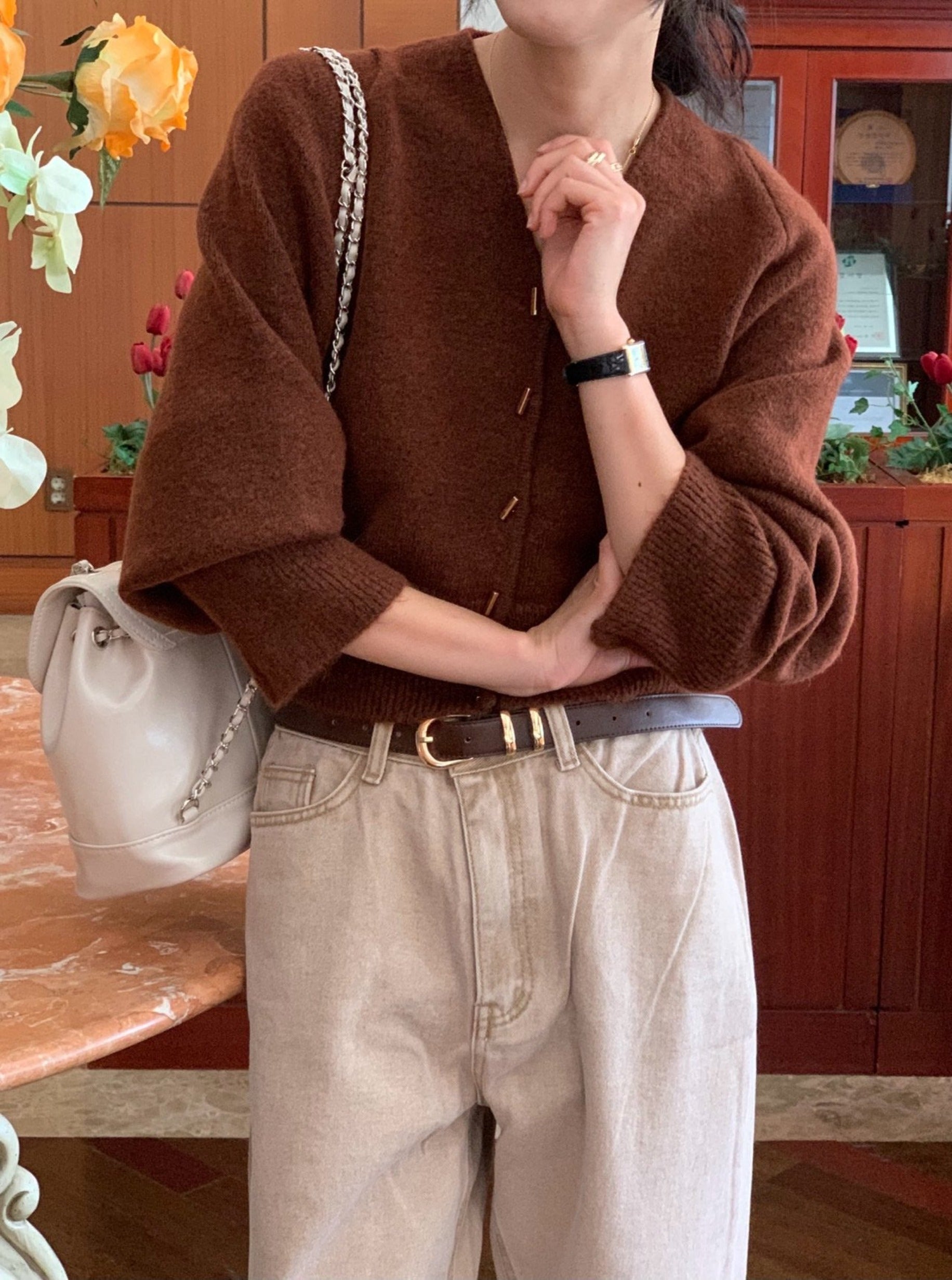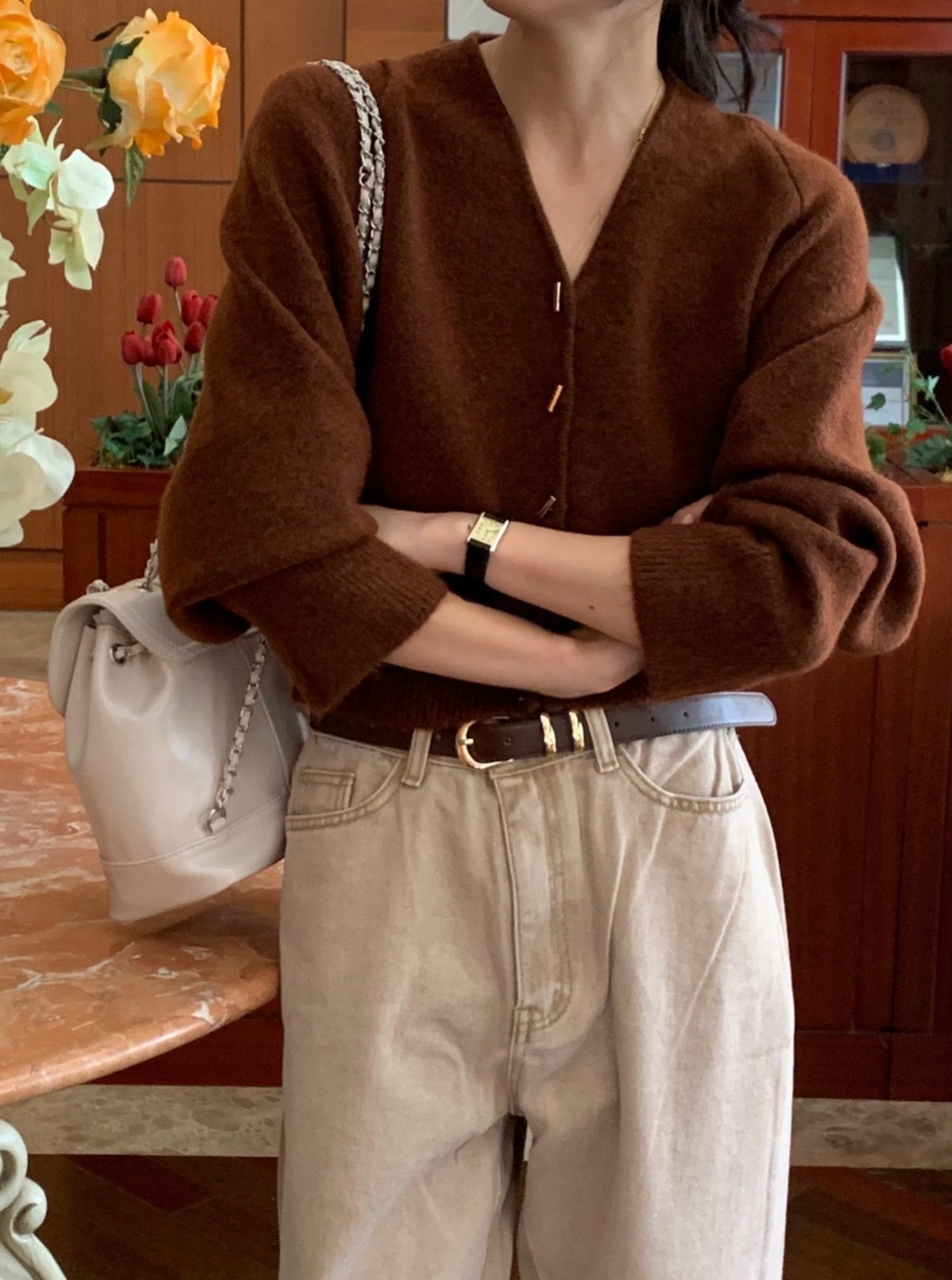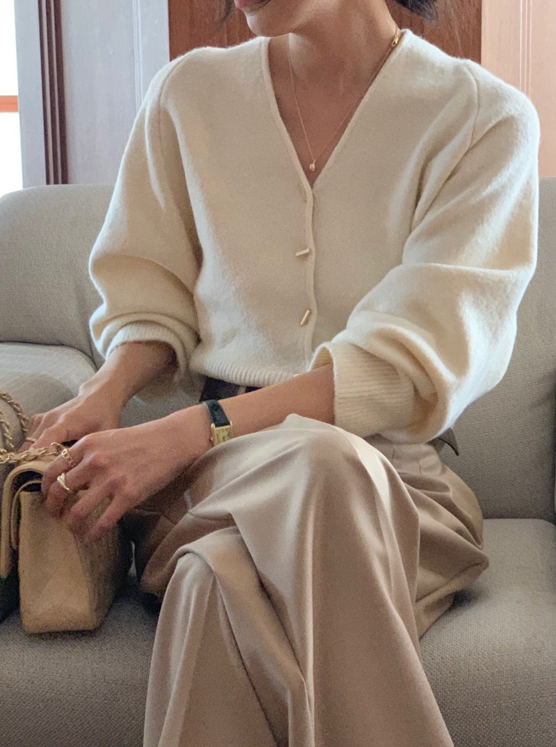 Keep warm and cozy with this adorable cardigan. This relaxed fit and crop length with raglan sleeve make it perfect elegant old money looks. Gold button makes a point of the look!