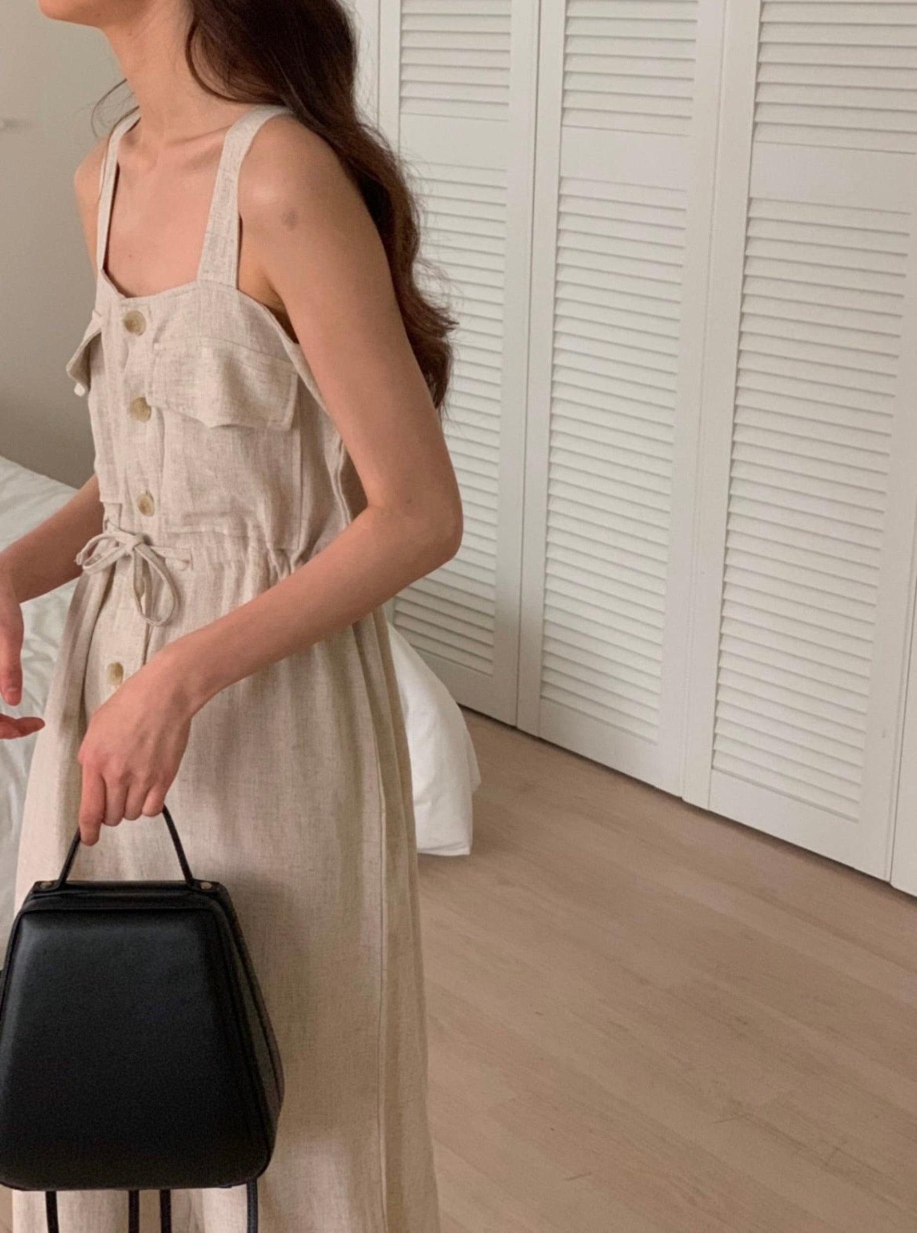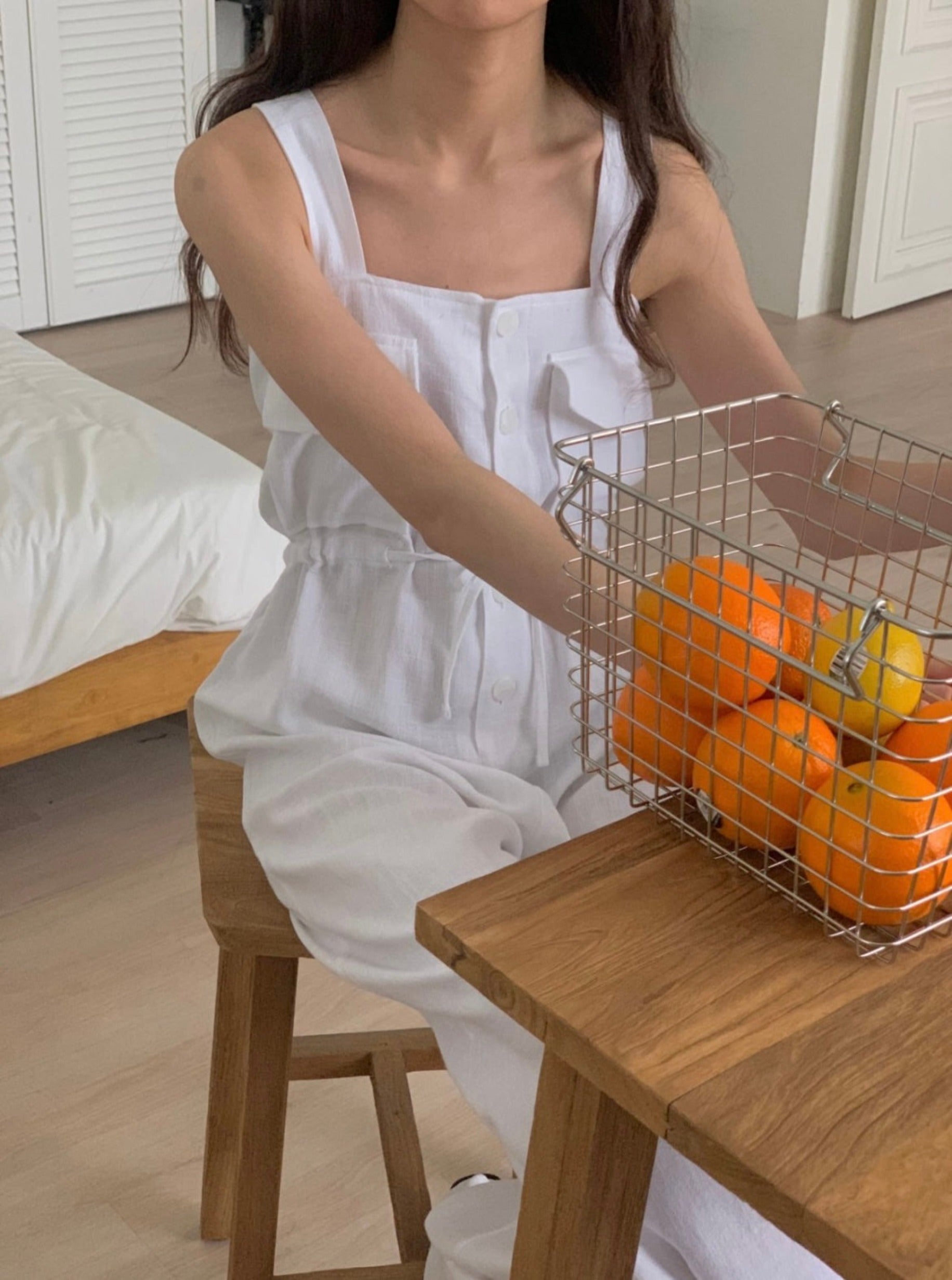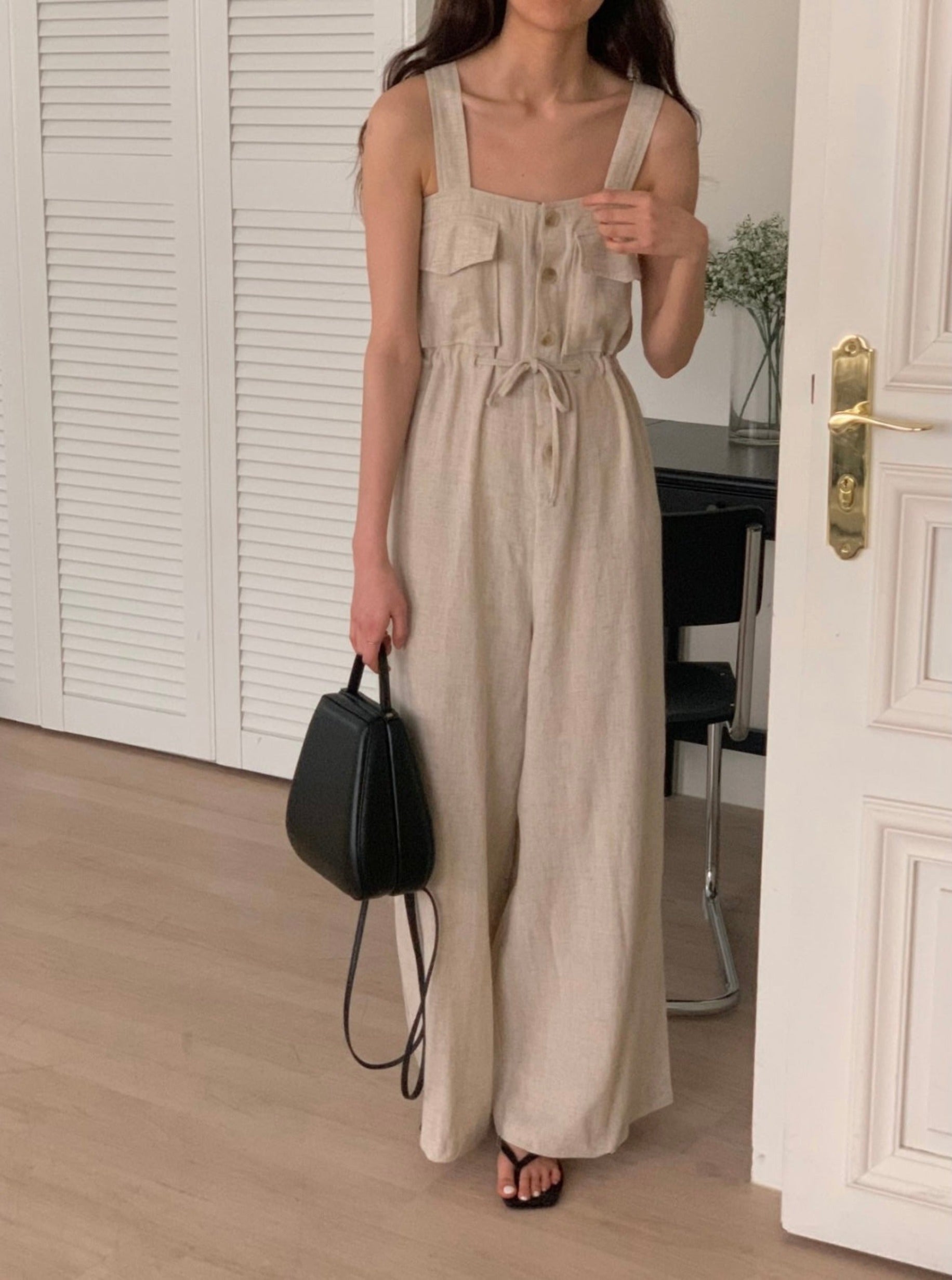Sleeveless, Adjustable waist tie, Button down , Sleeveless, Chest pockets, Wide pants