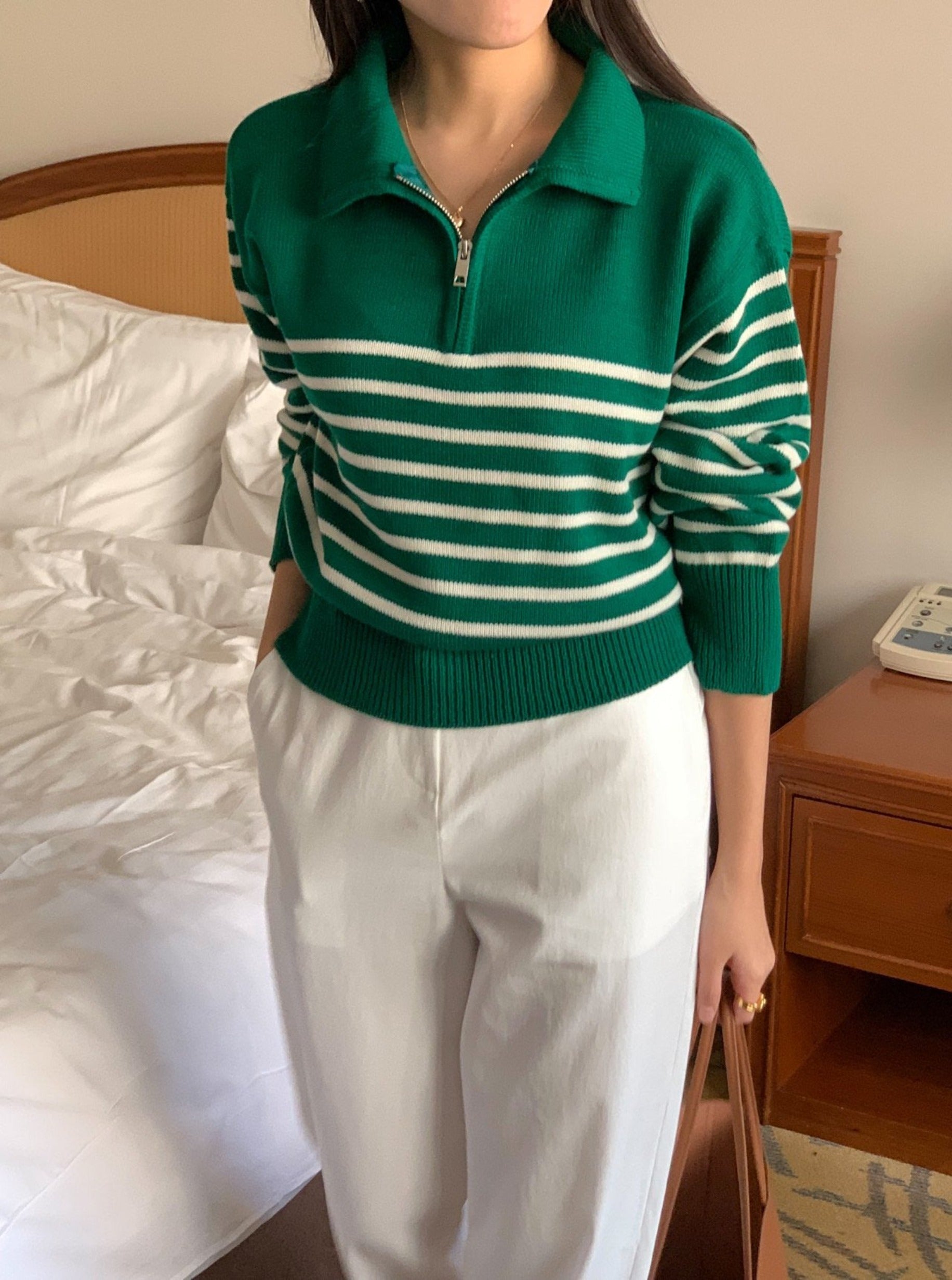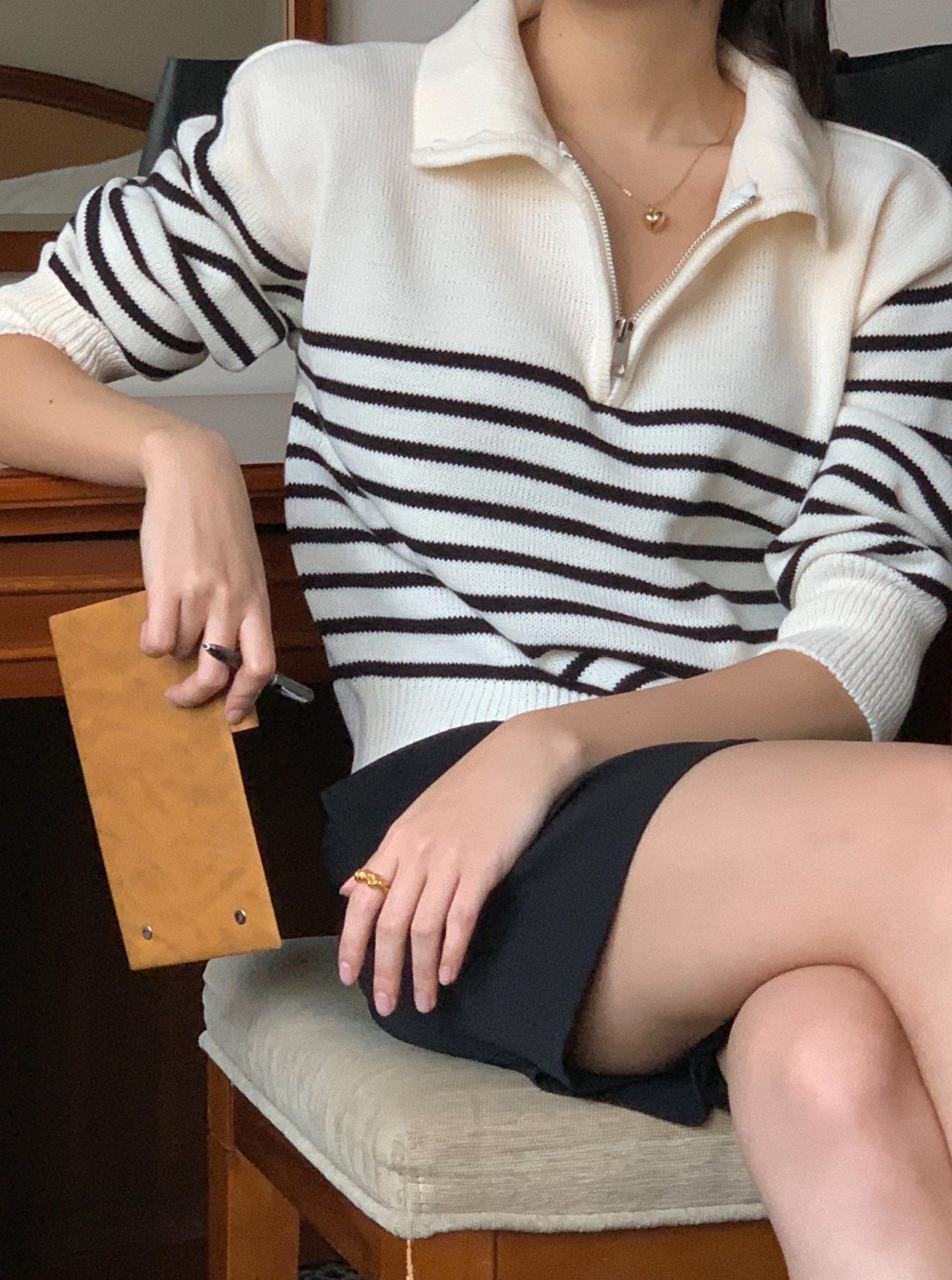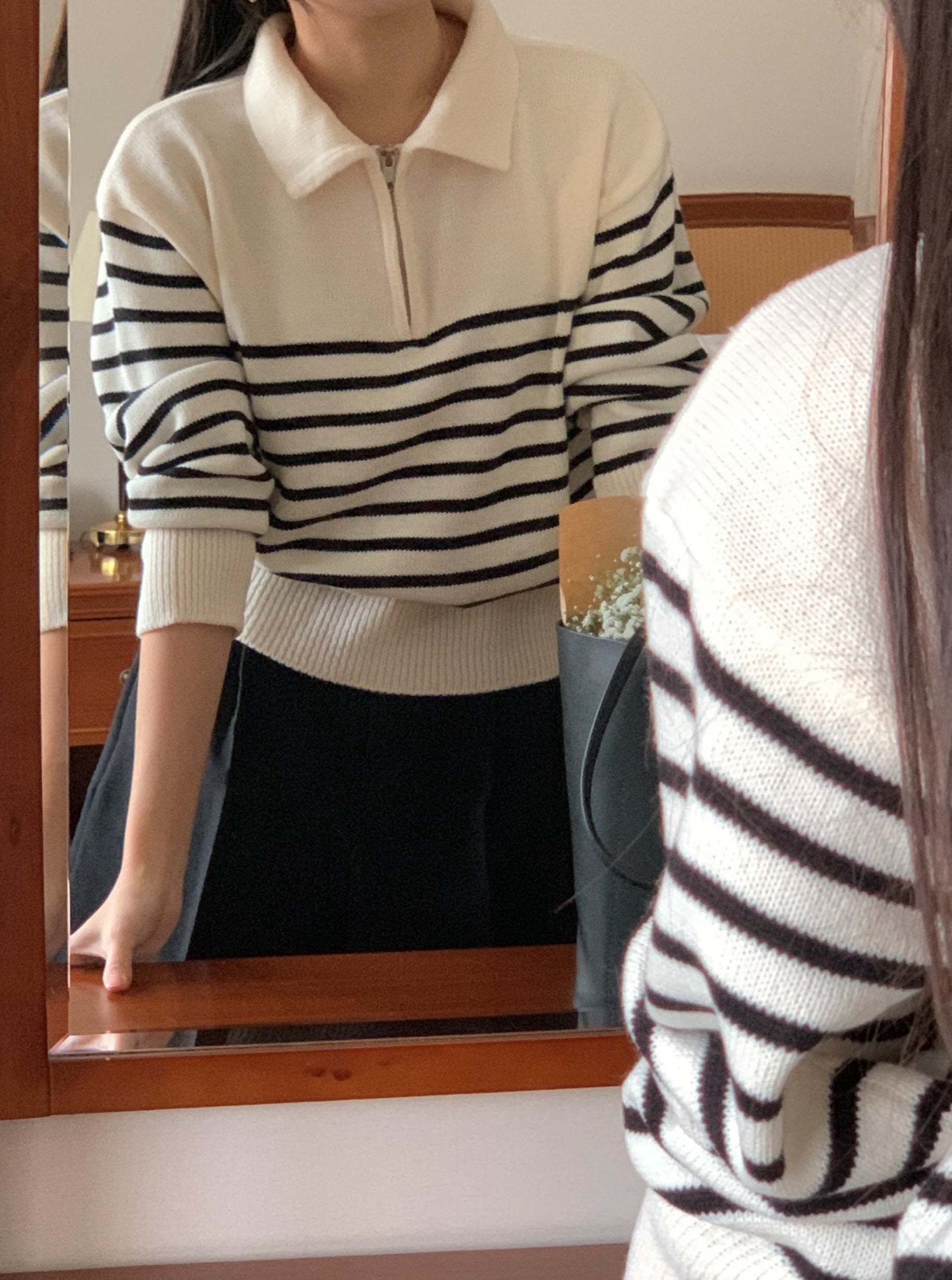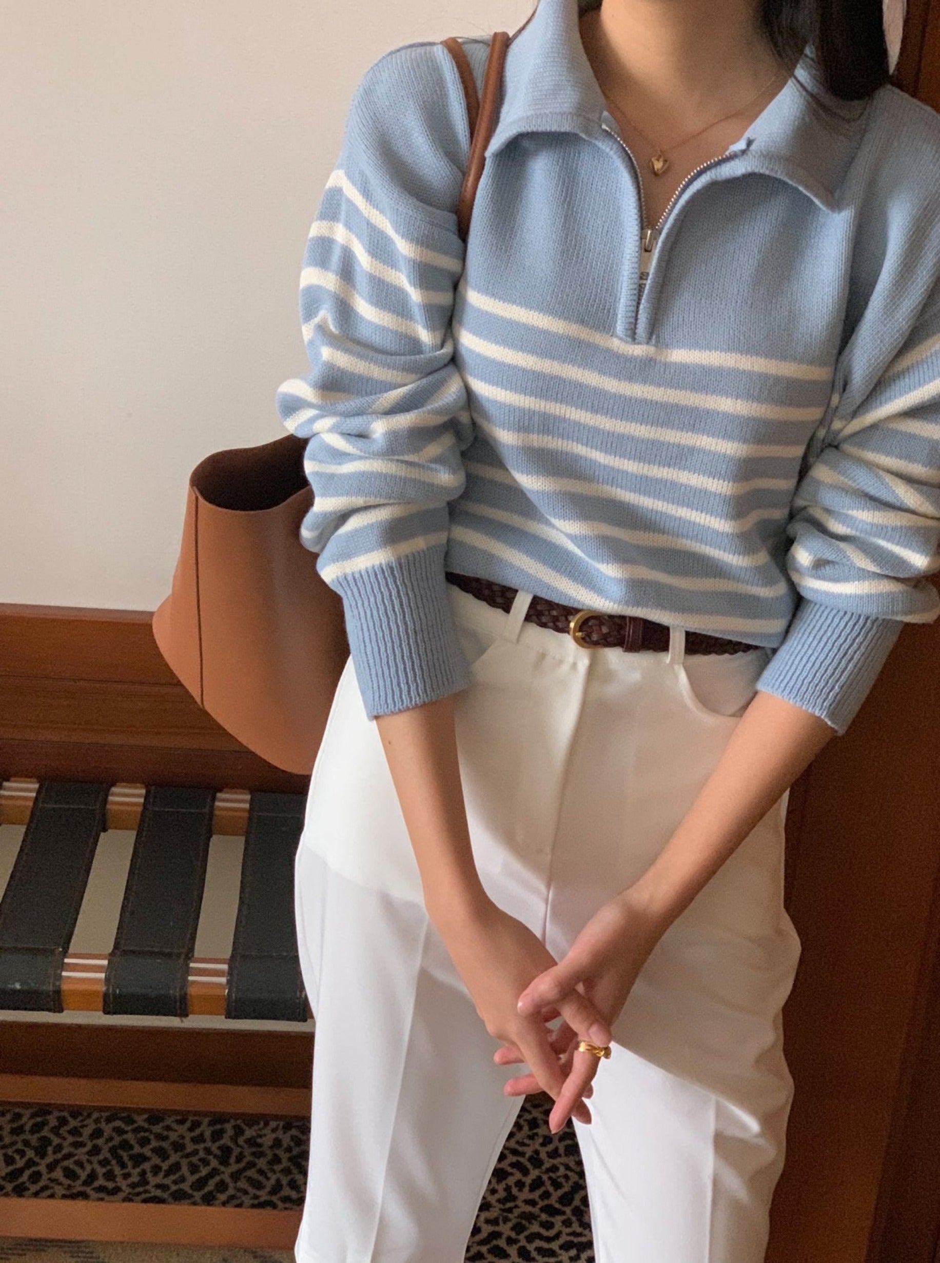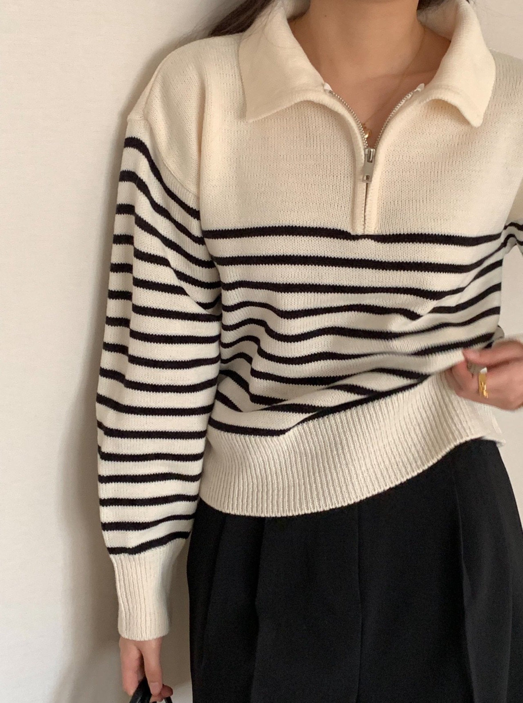 This cozy knit top is featured in a collar neck , drop shoulder with half zip-up.