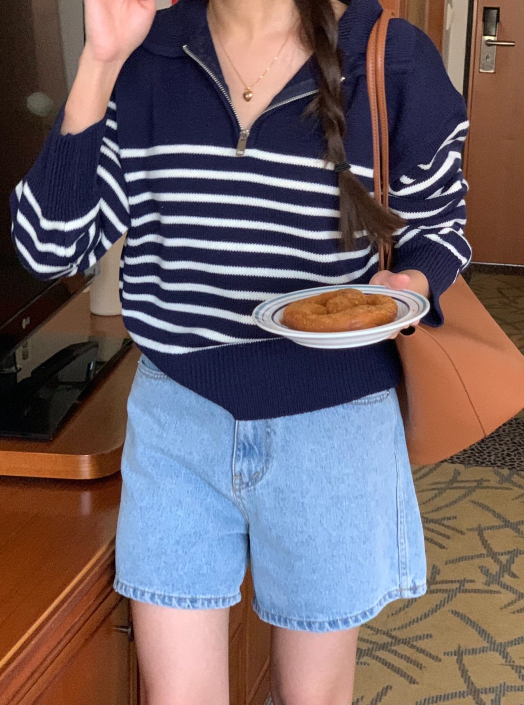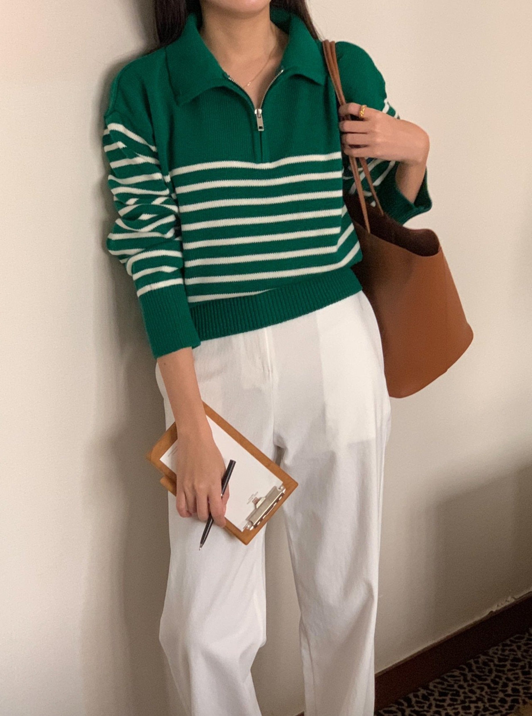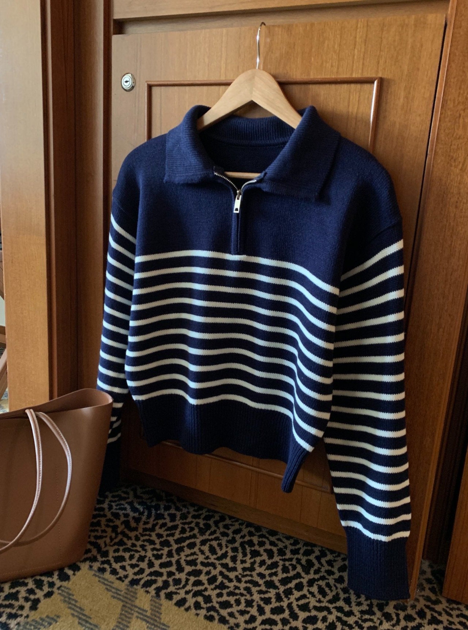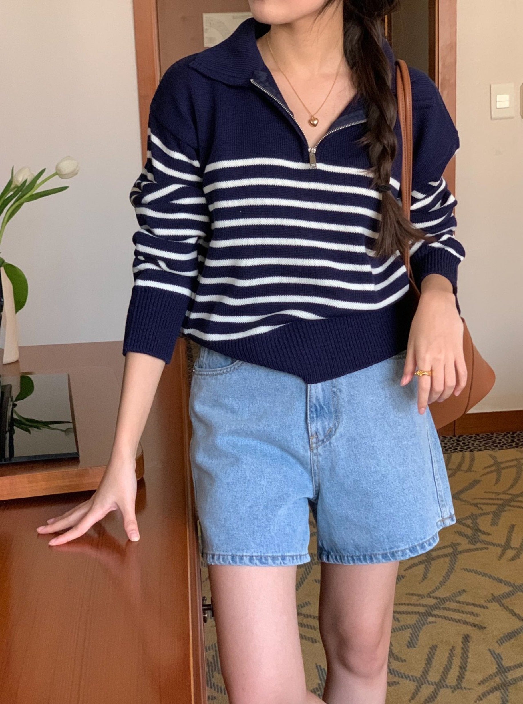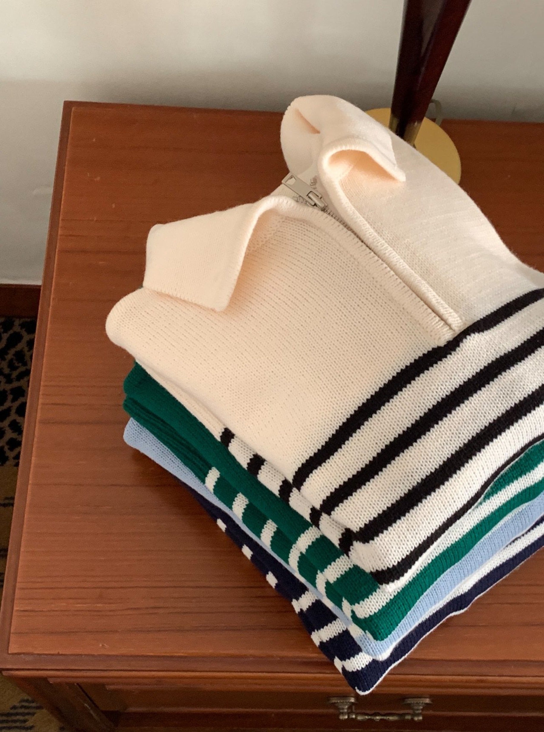 This cozy knit top is featured in a collar neck , drop shoulder with half zip-up.