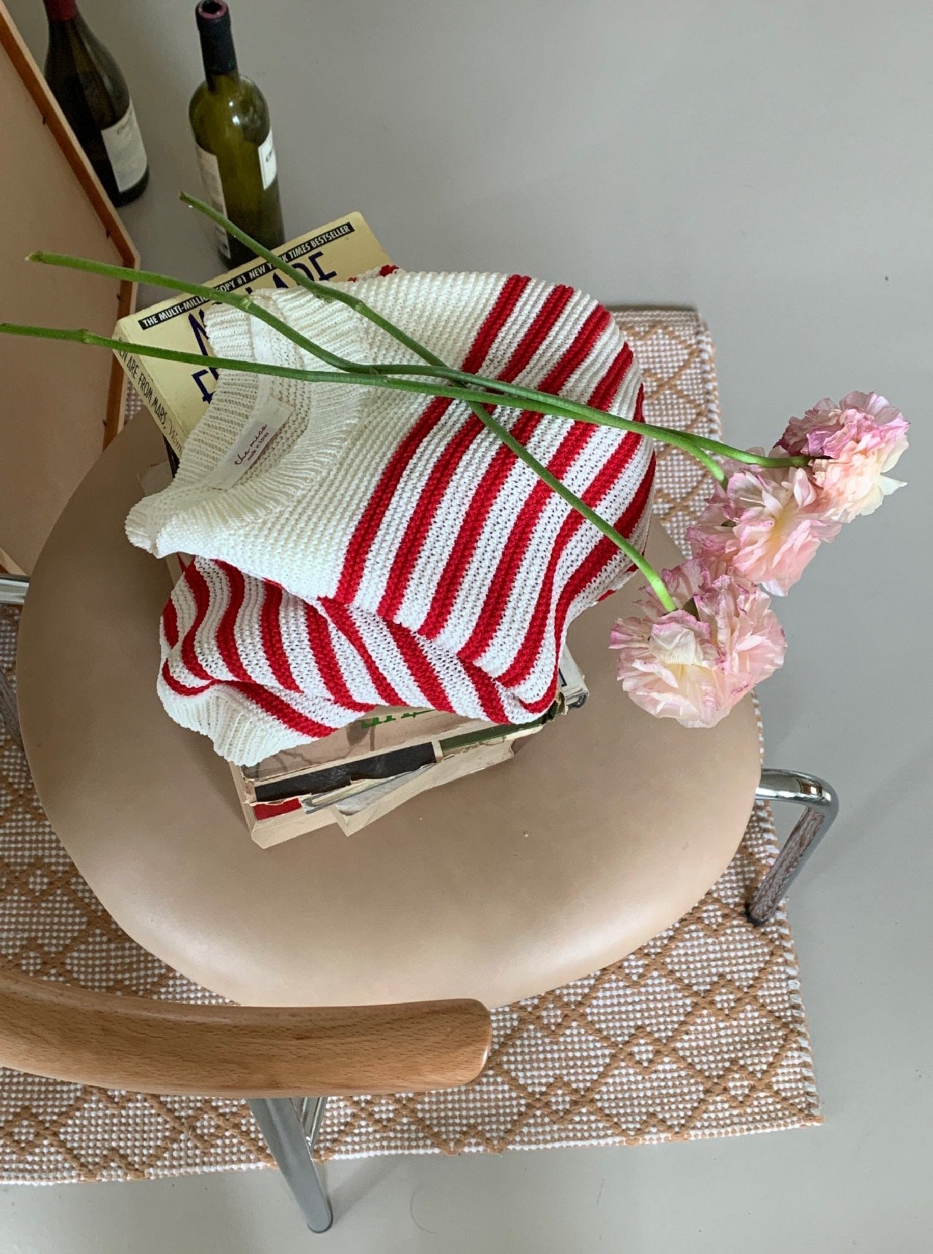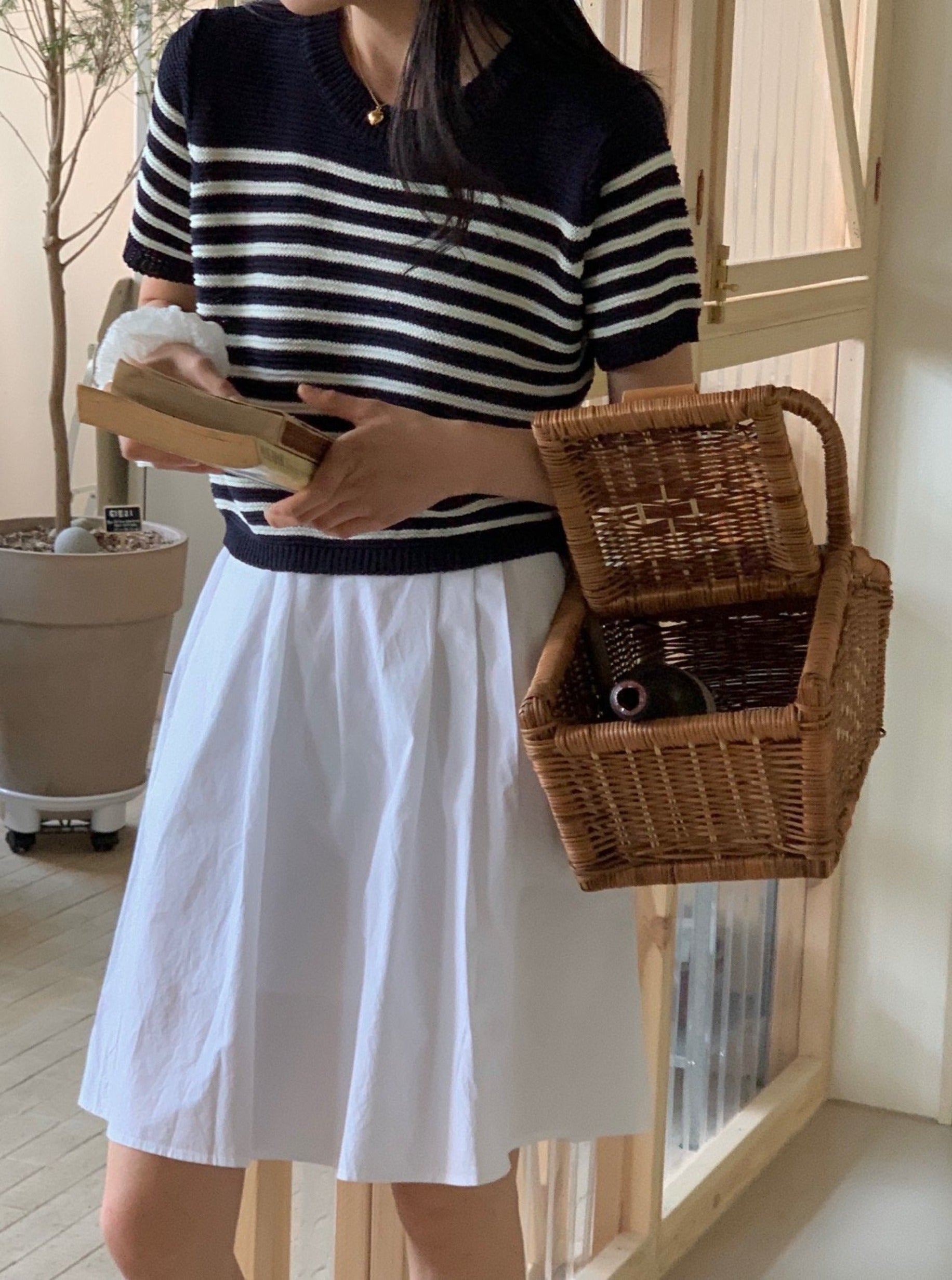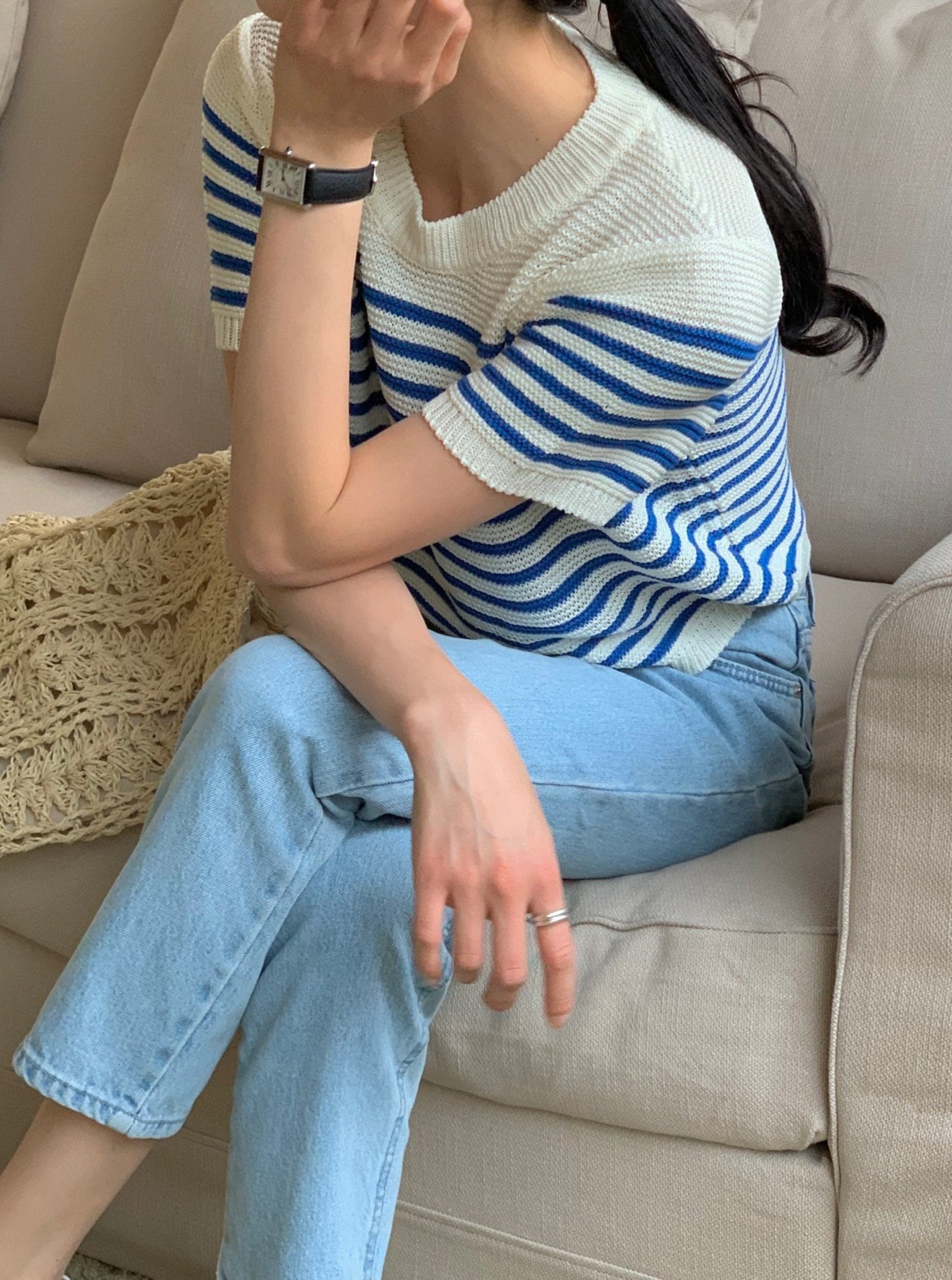 This cozy knit top is featured in a round neck , short sleeve with stripe.