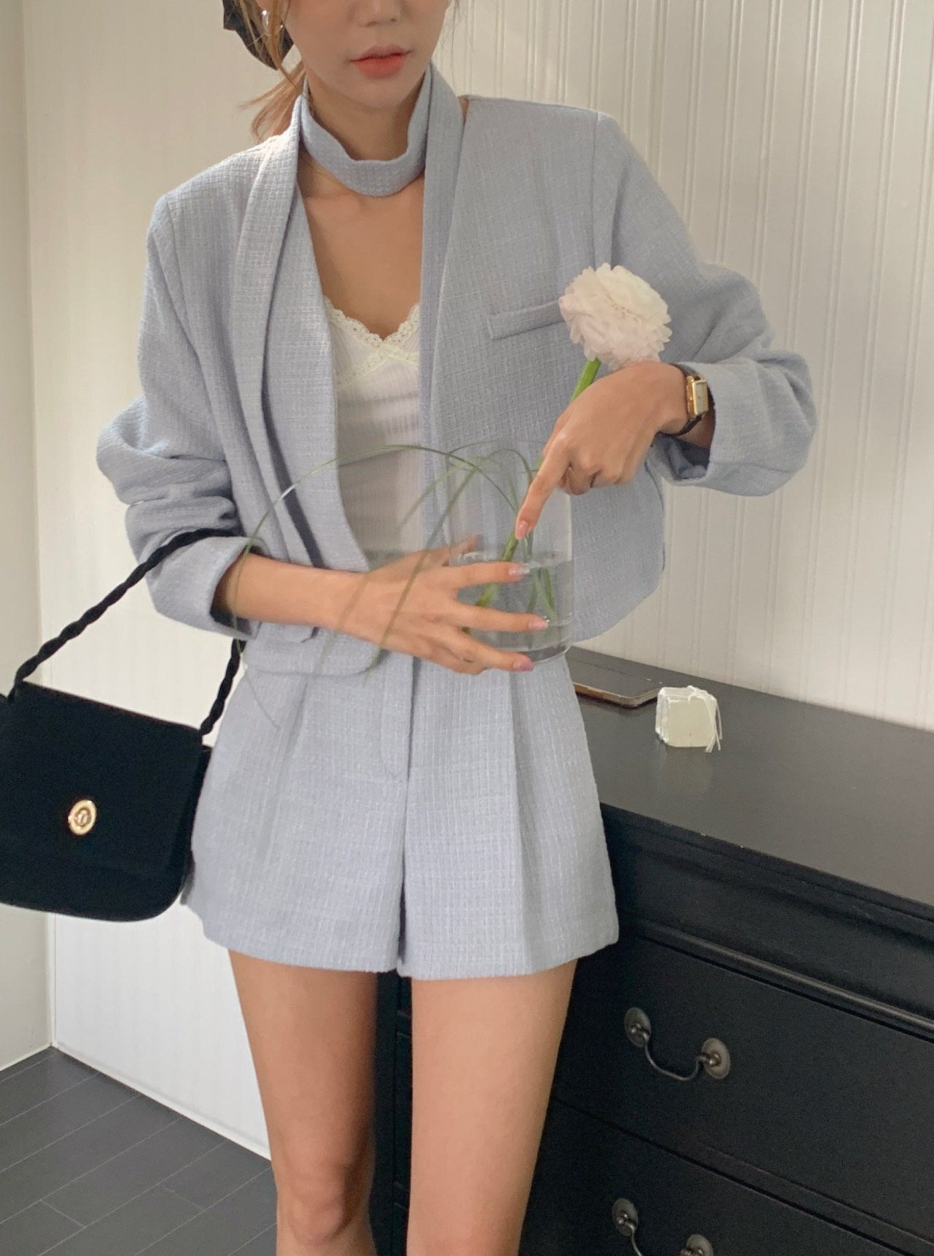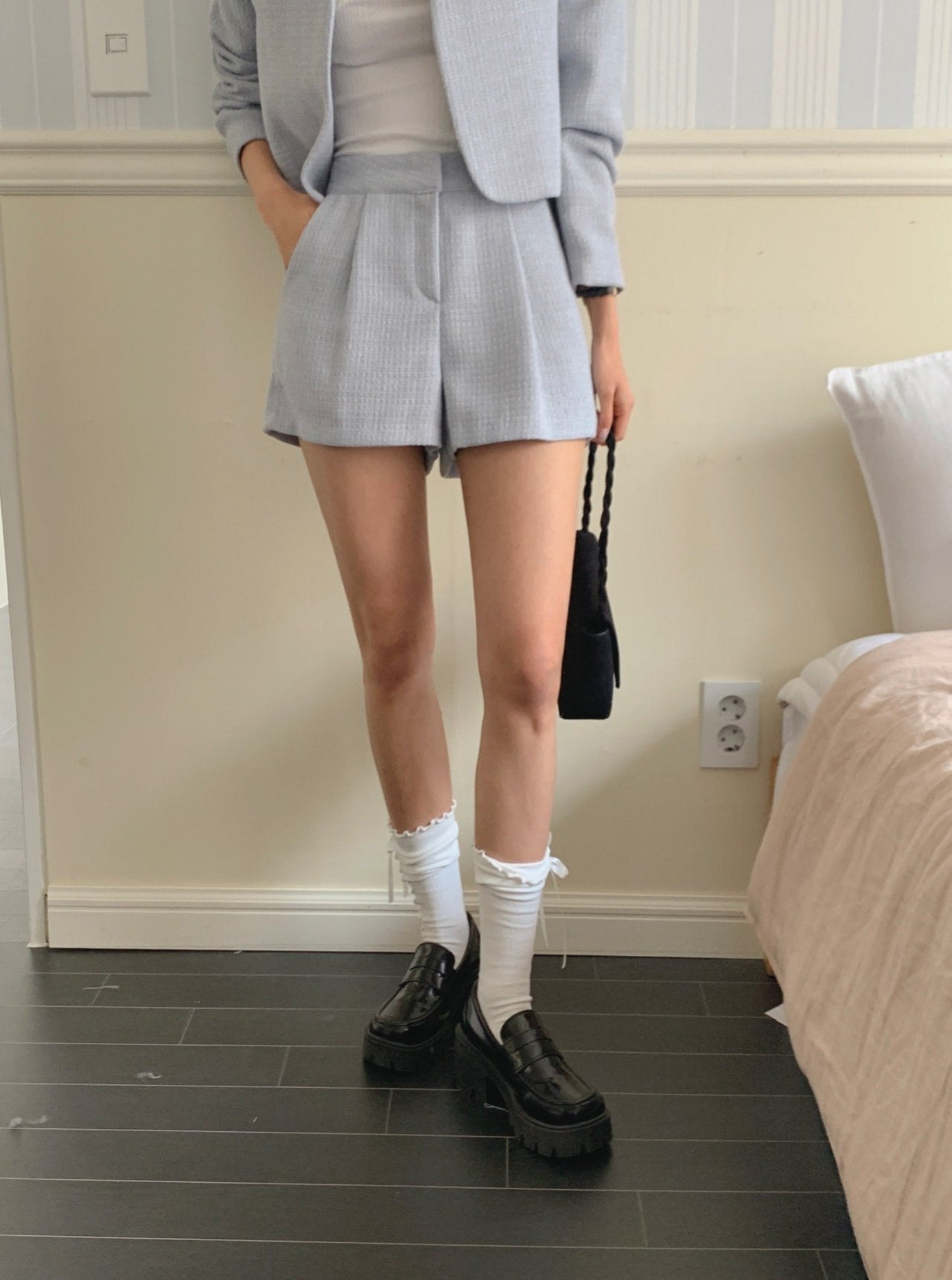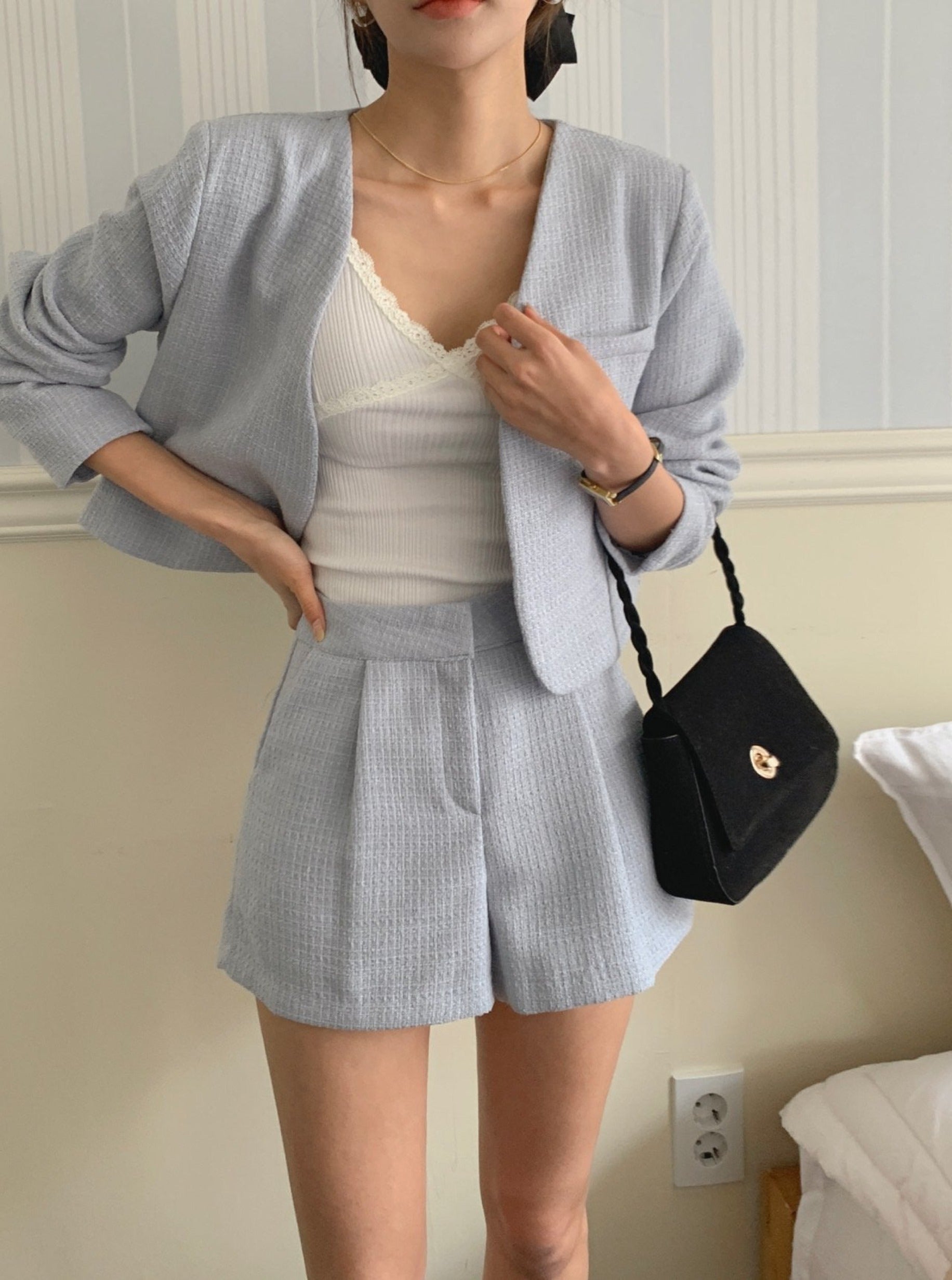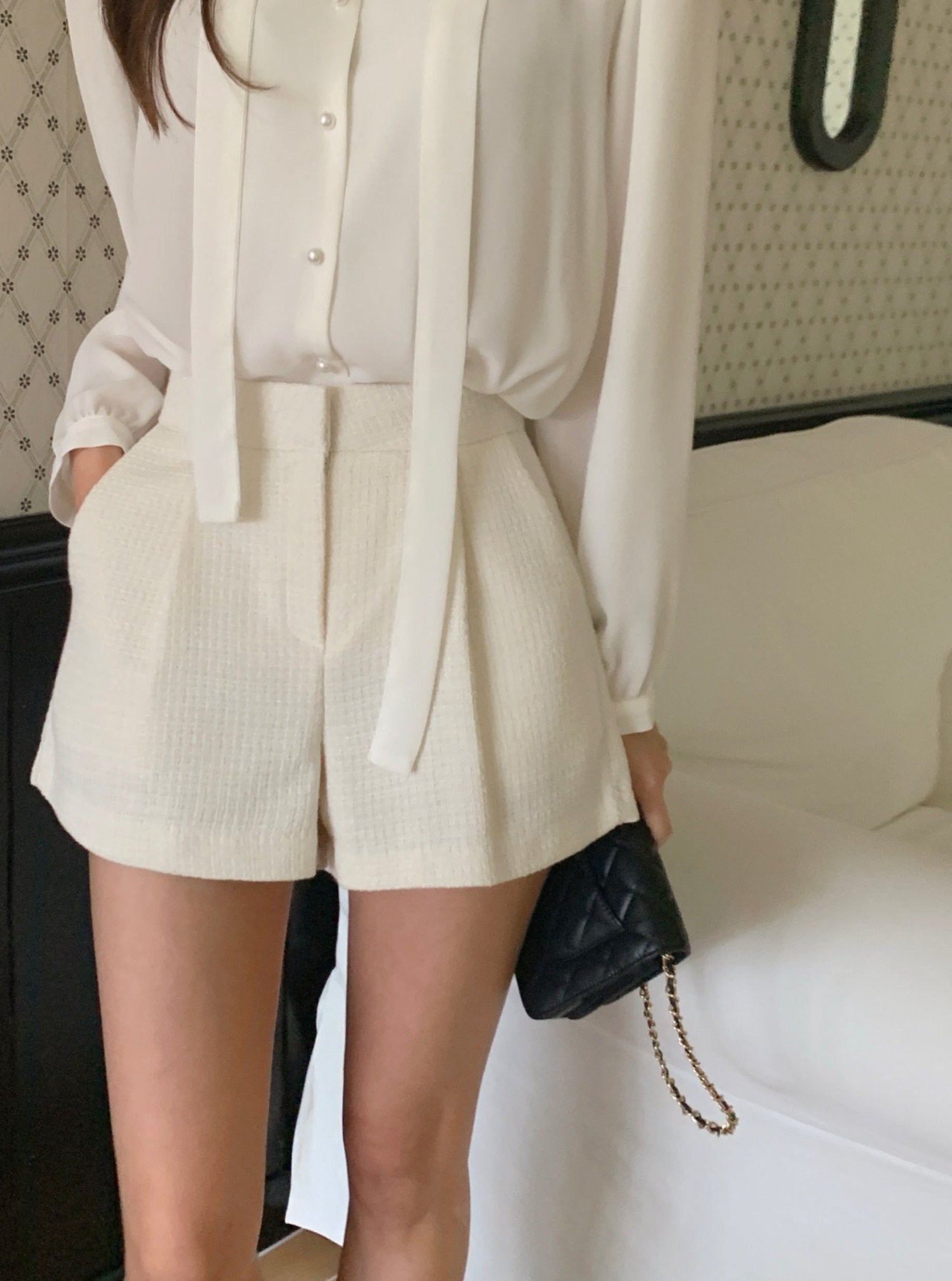 Refreshed sophistication in these pintuck tweed shorts designed in a skimming high-rise silhouette with pockets details.