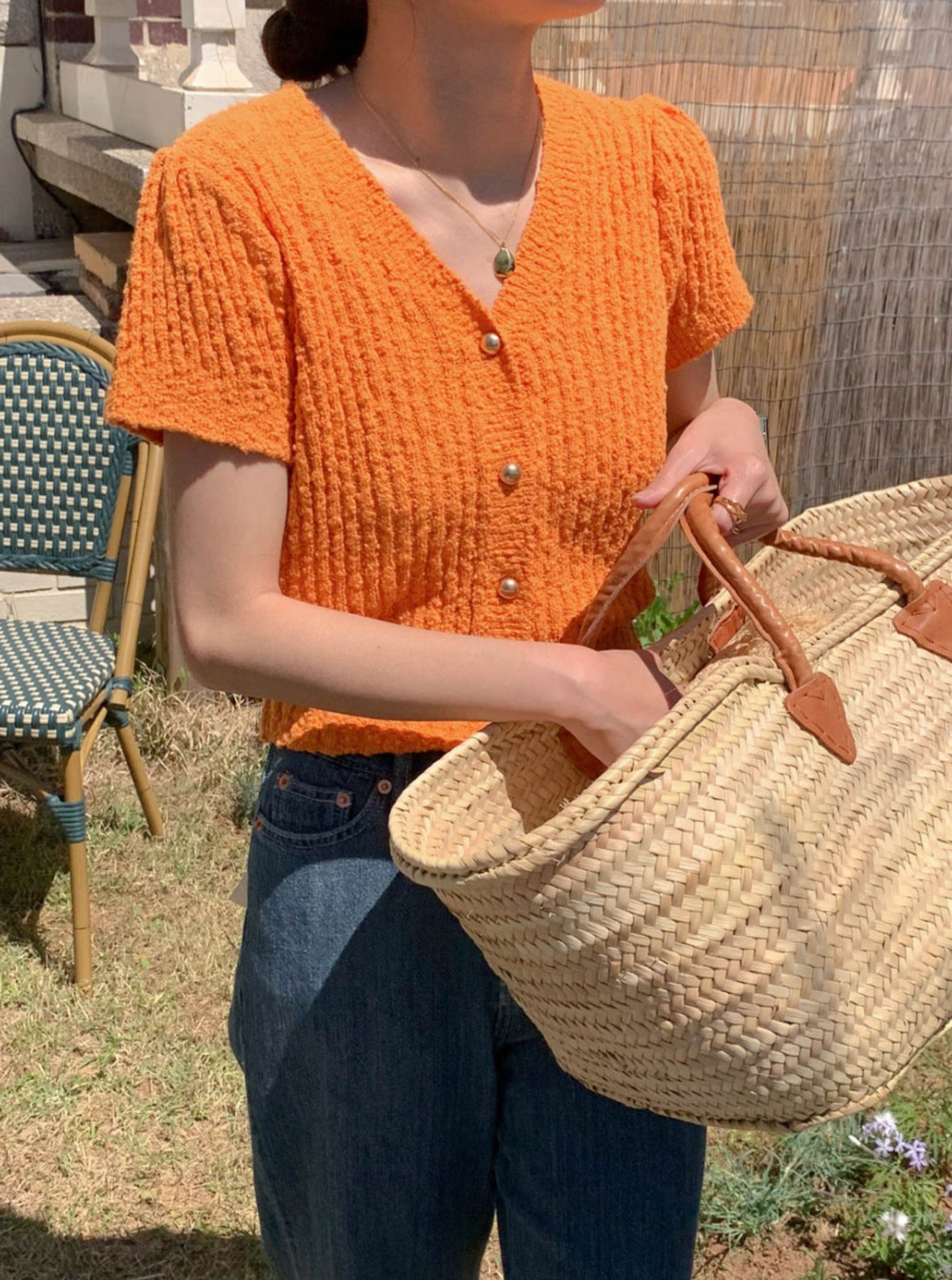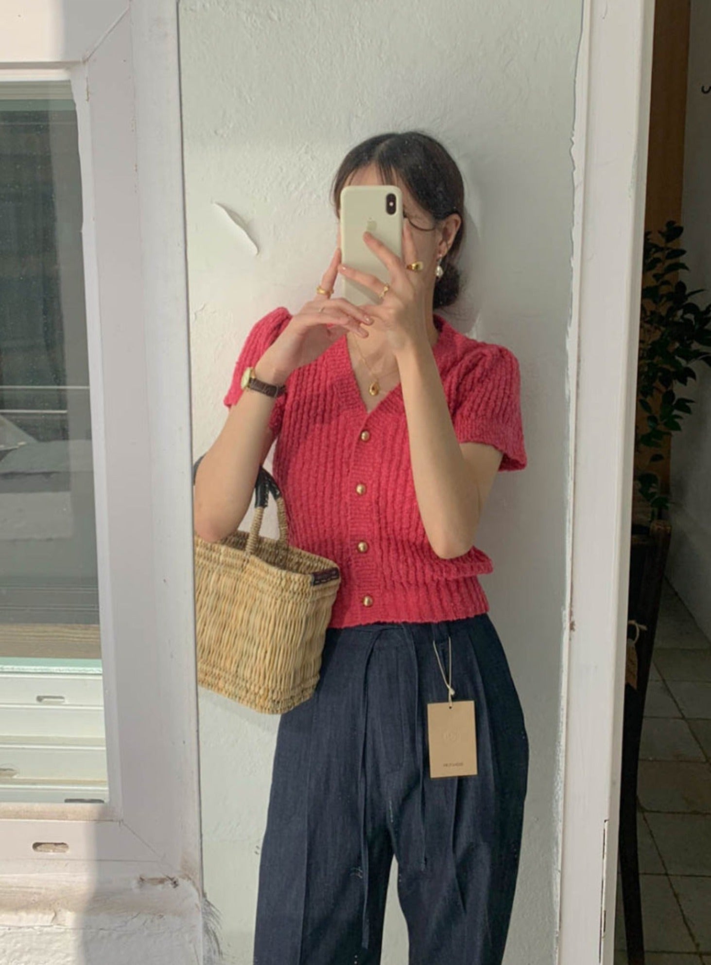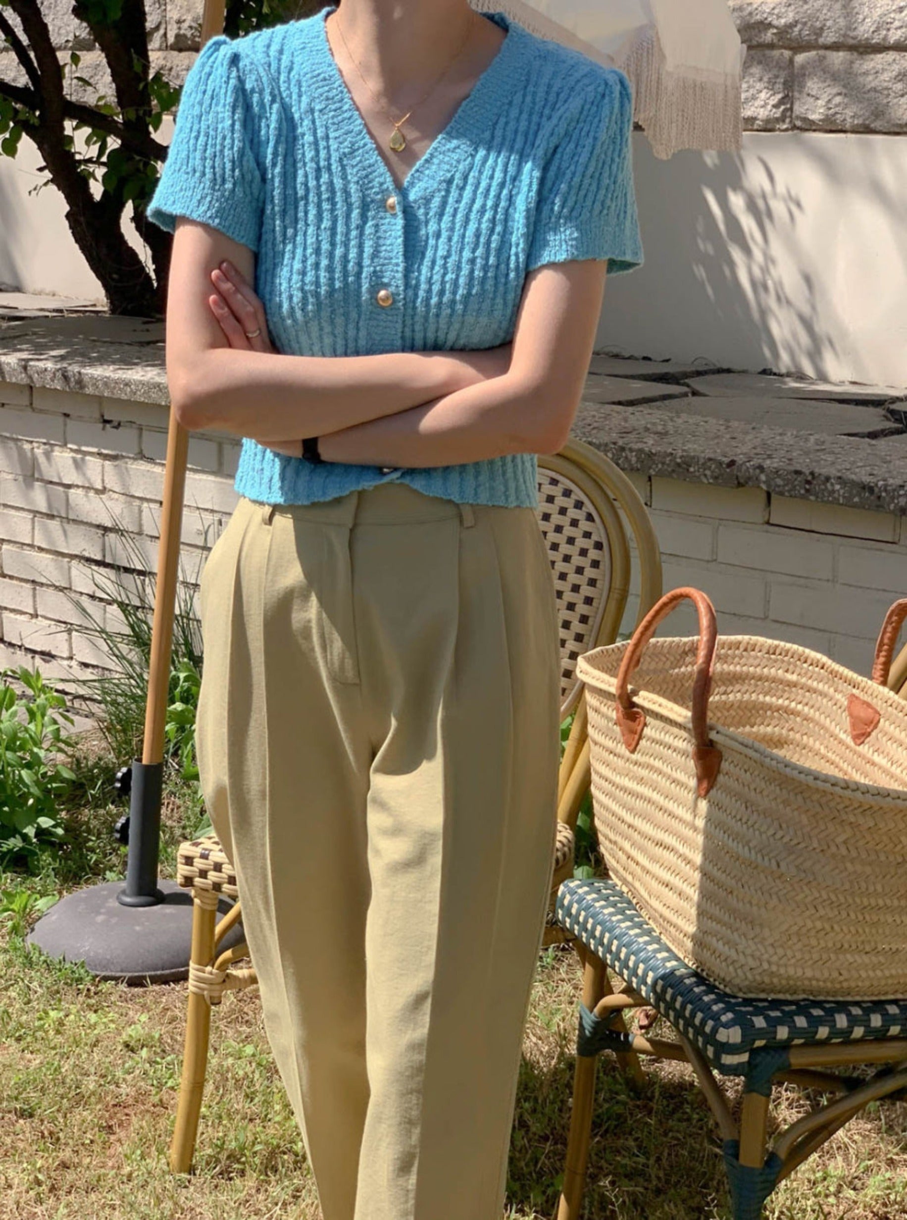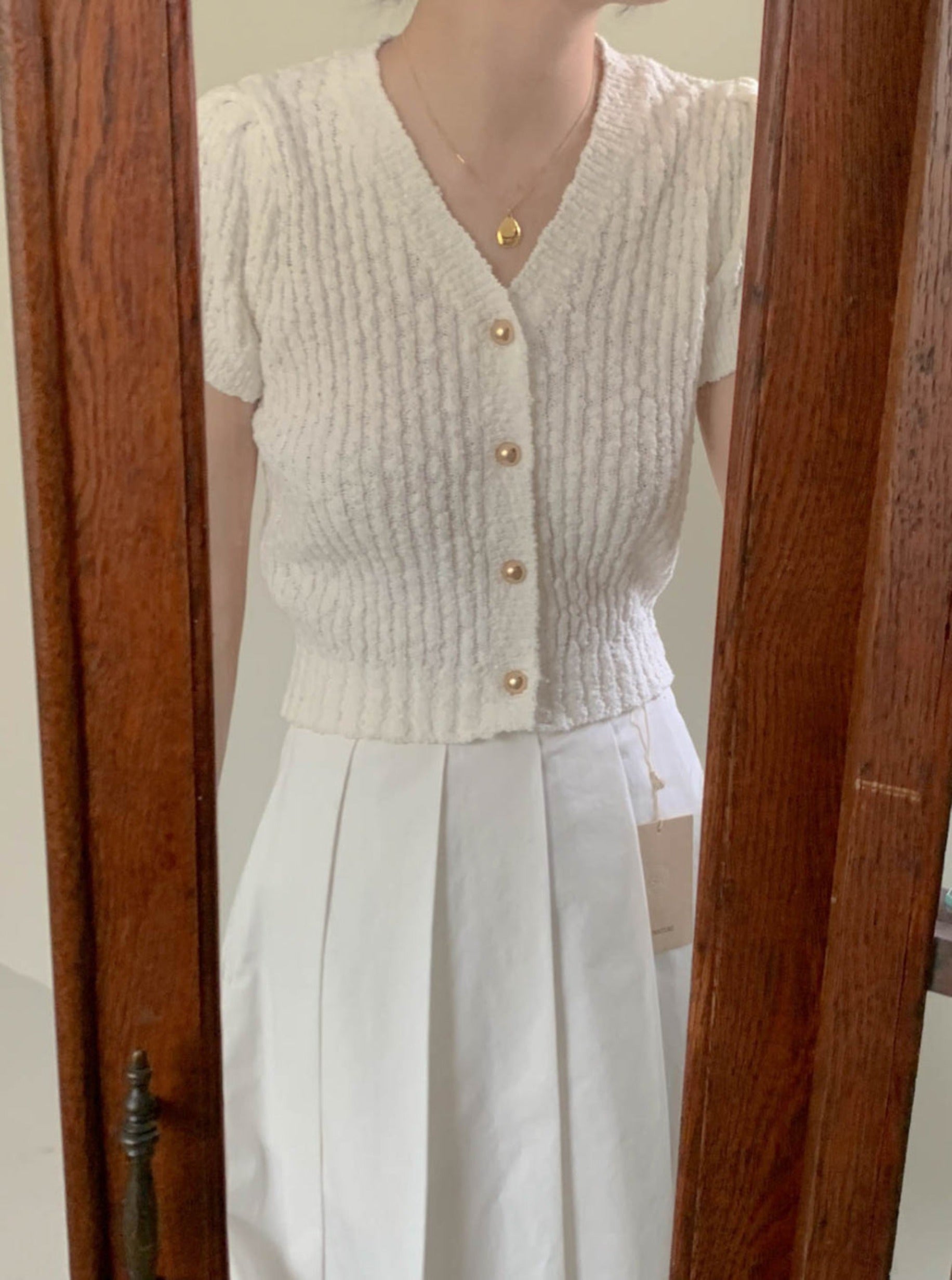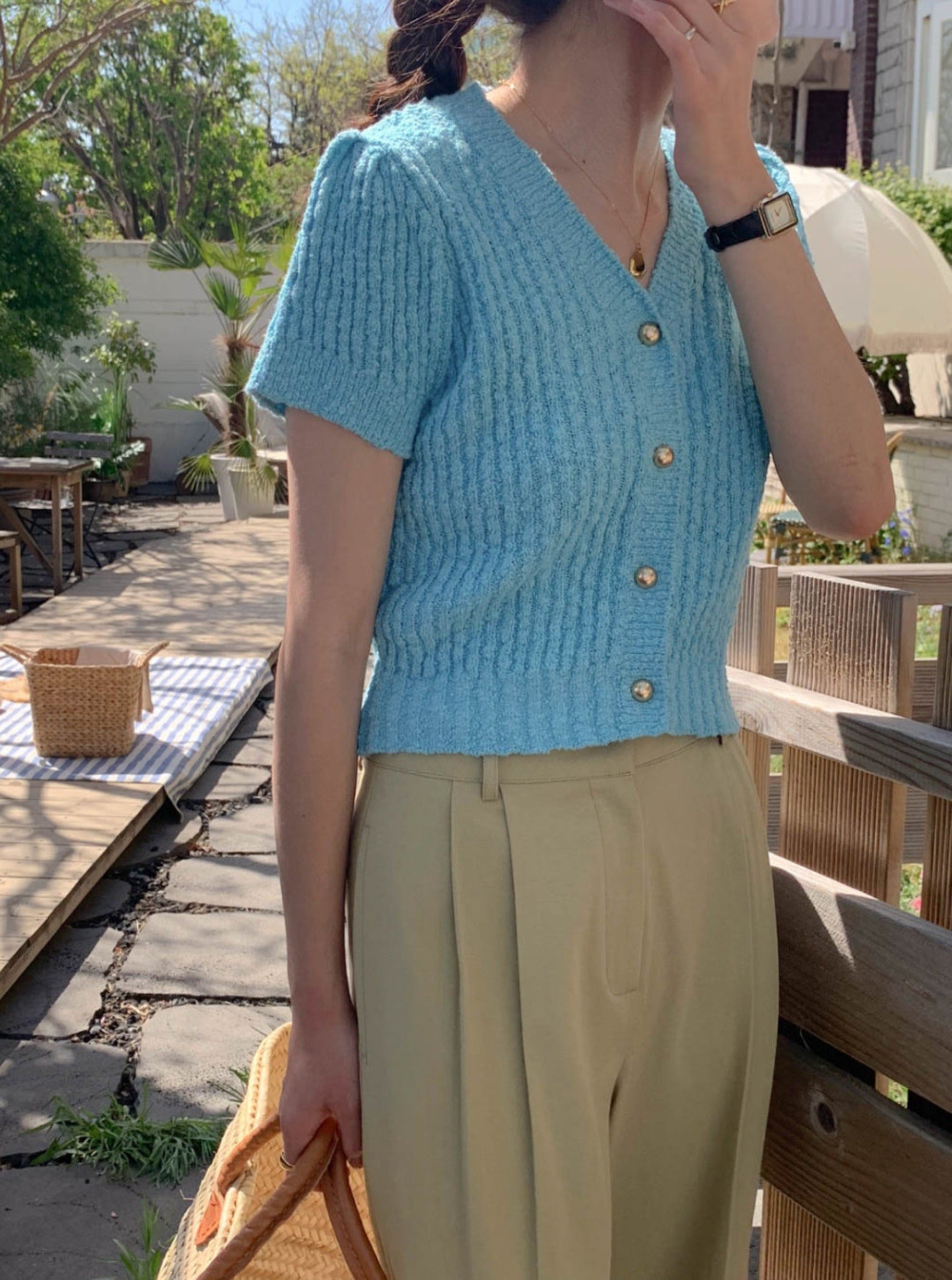 V neck, Button down, Short puff sleeve, Soft and cozy fabric