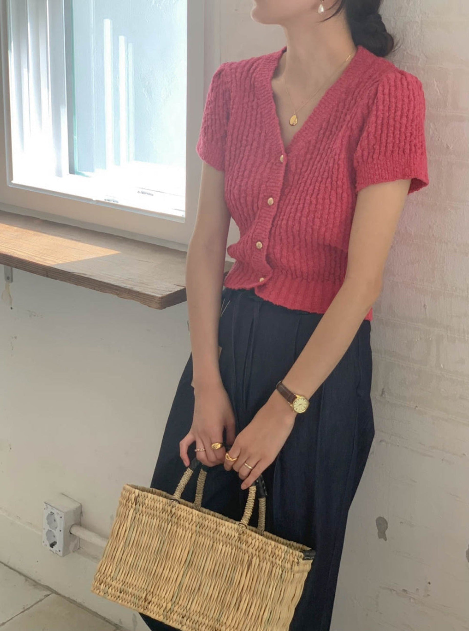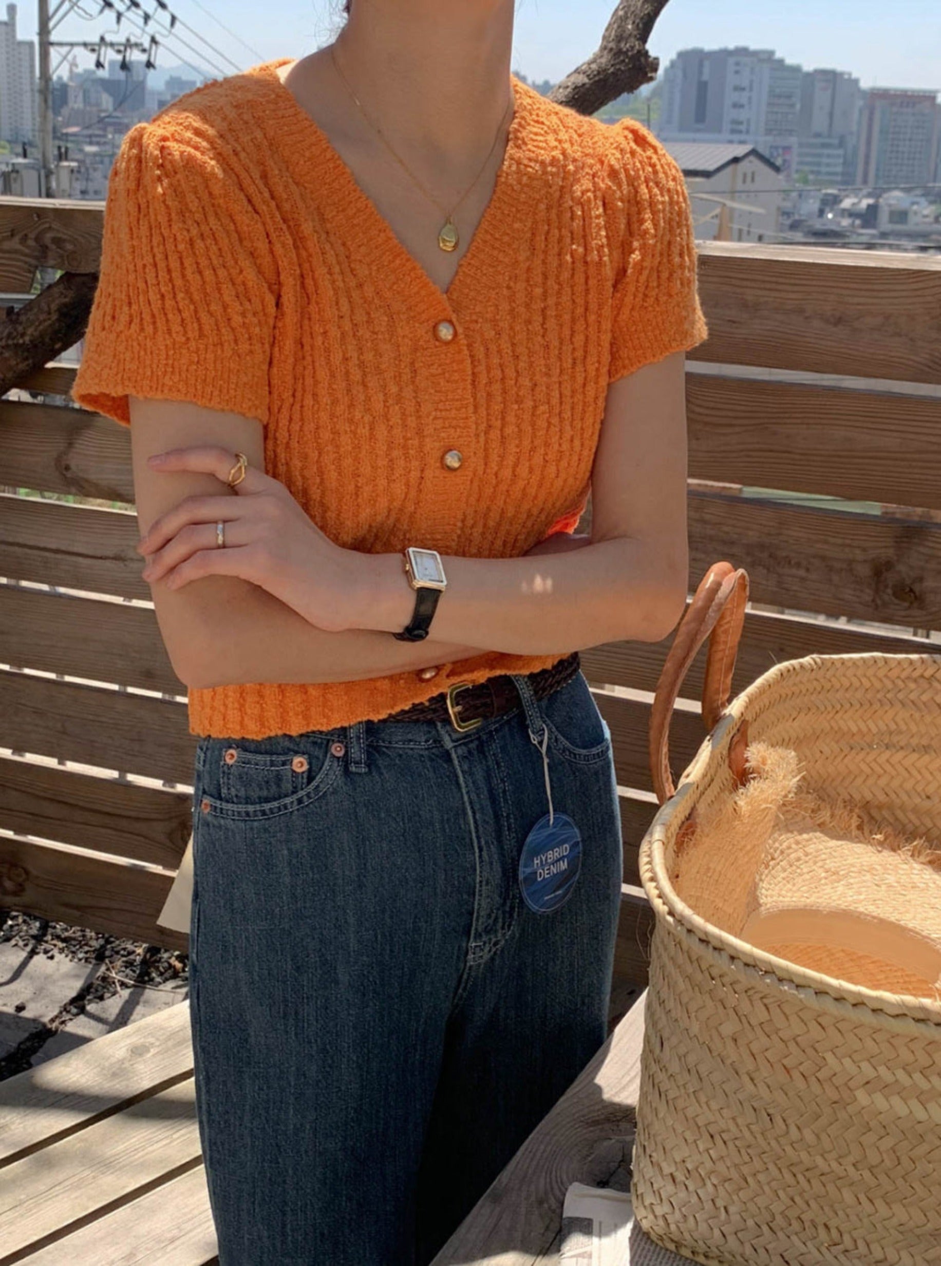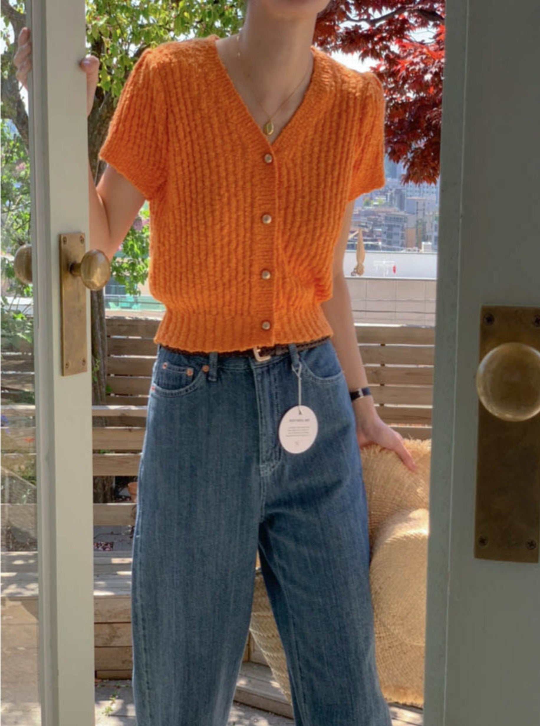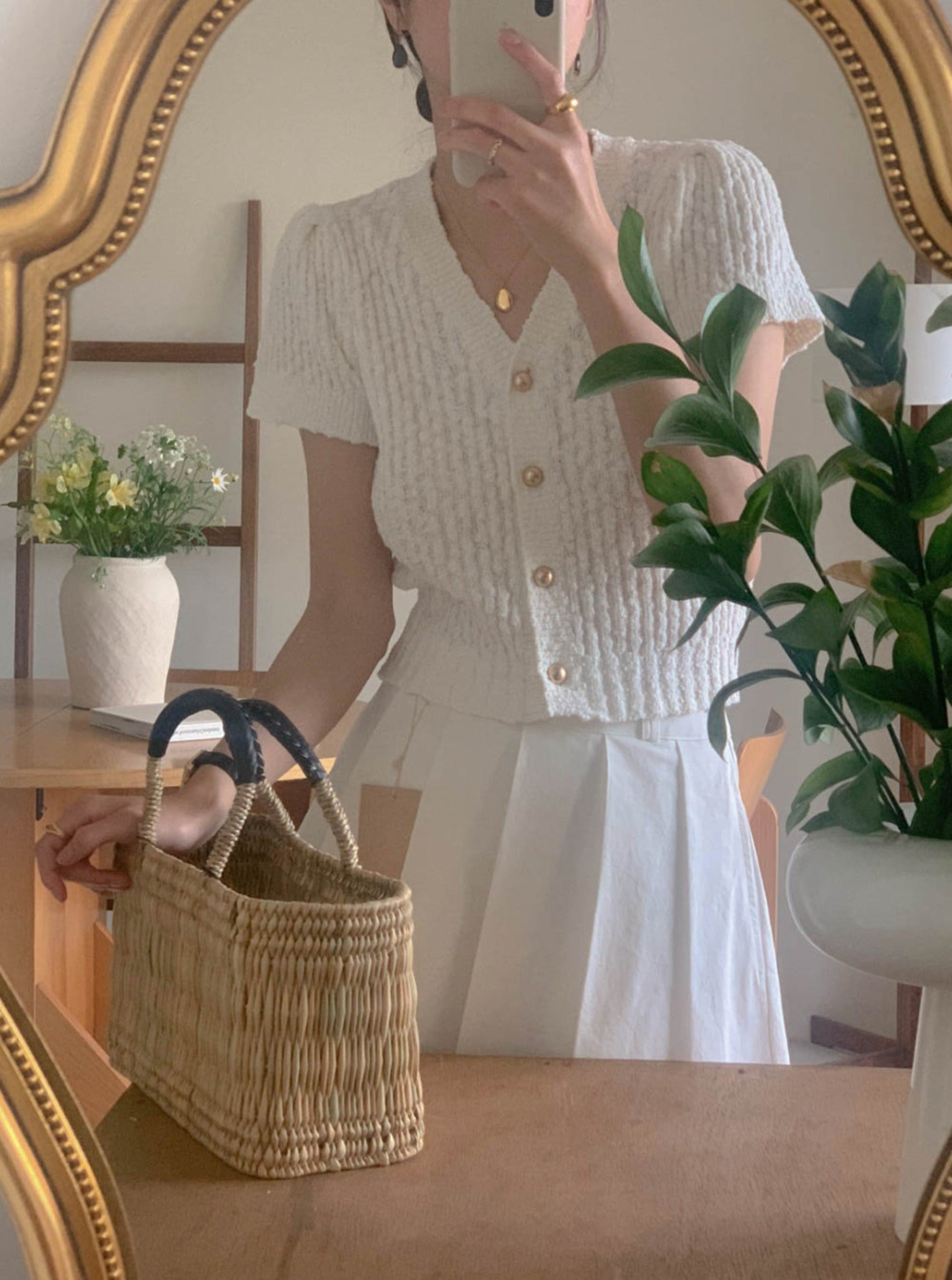 V neck, Button down, Short puff sleeve, Soft and cozy fabric