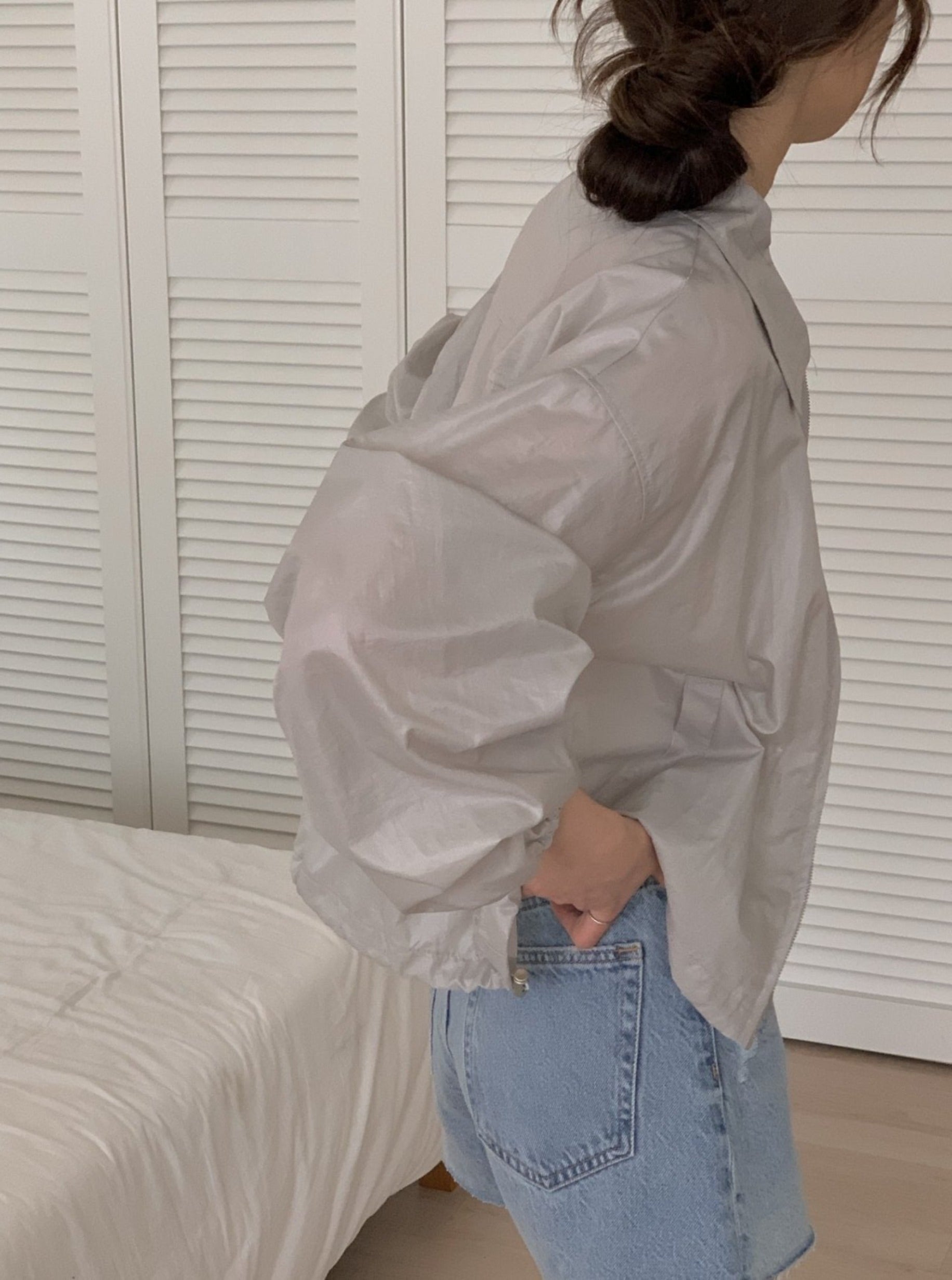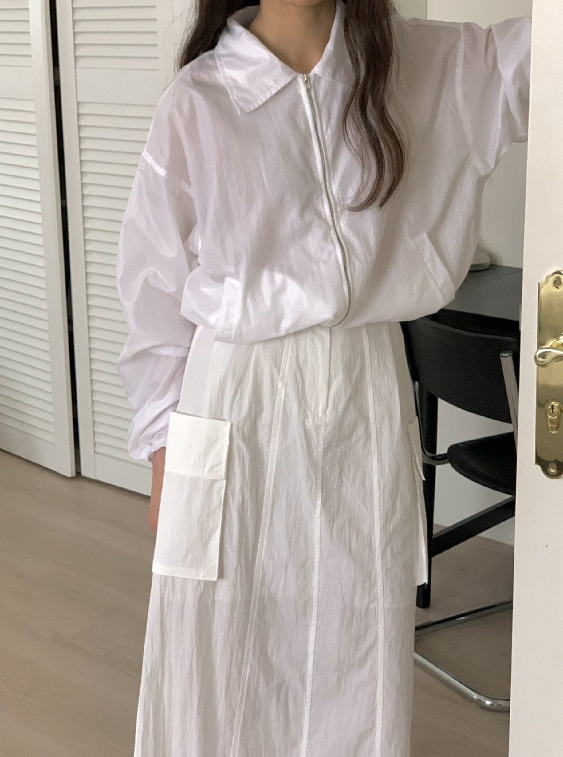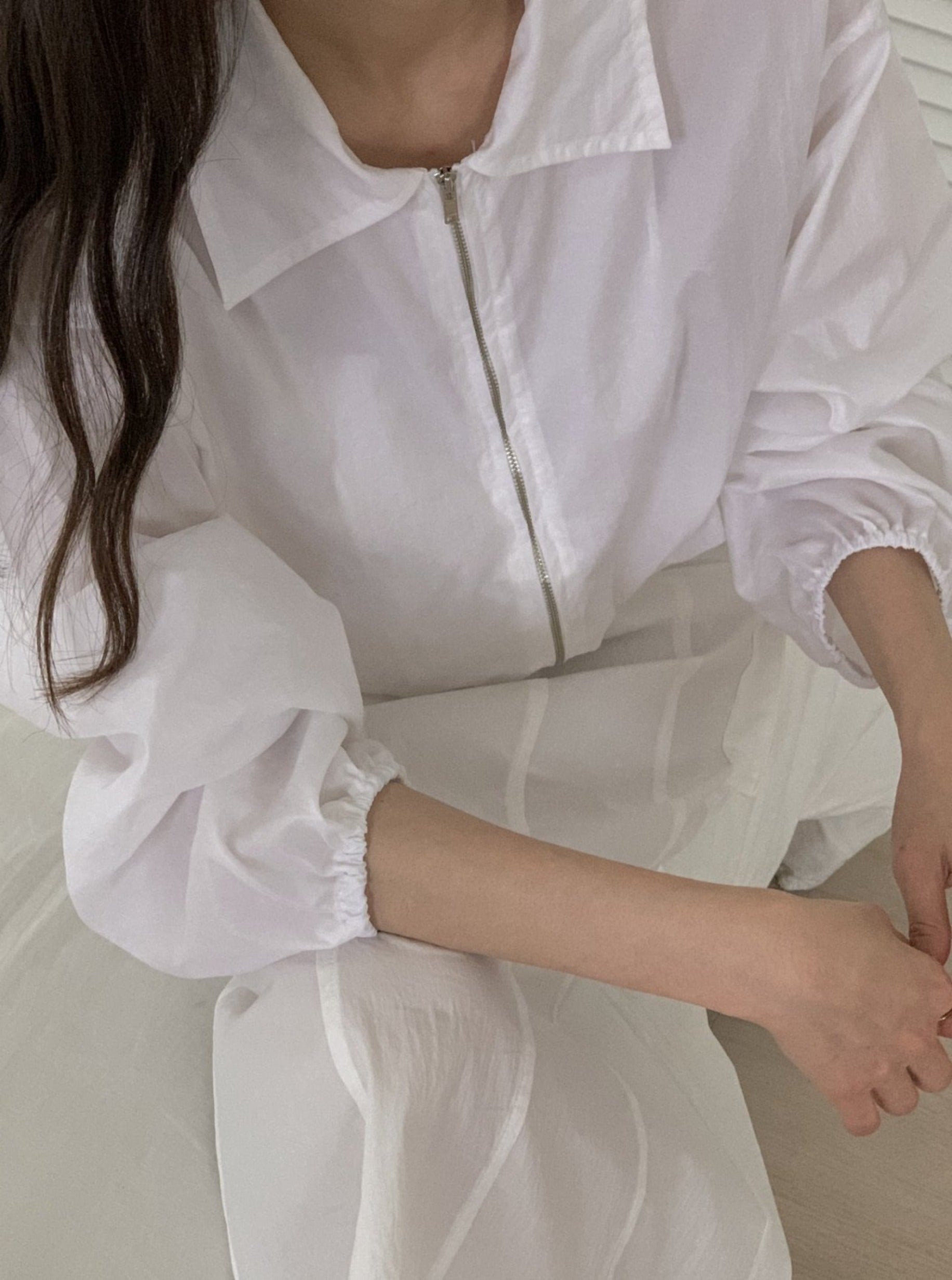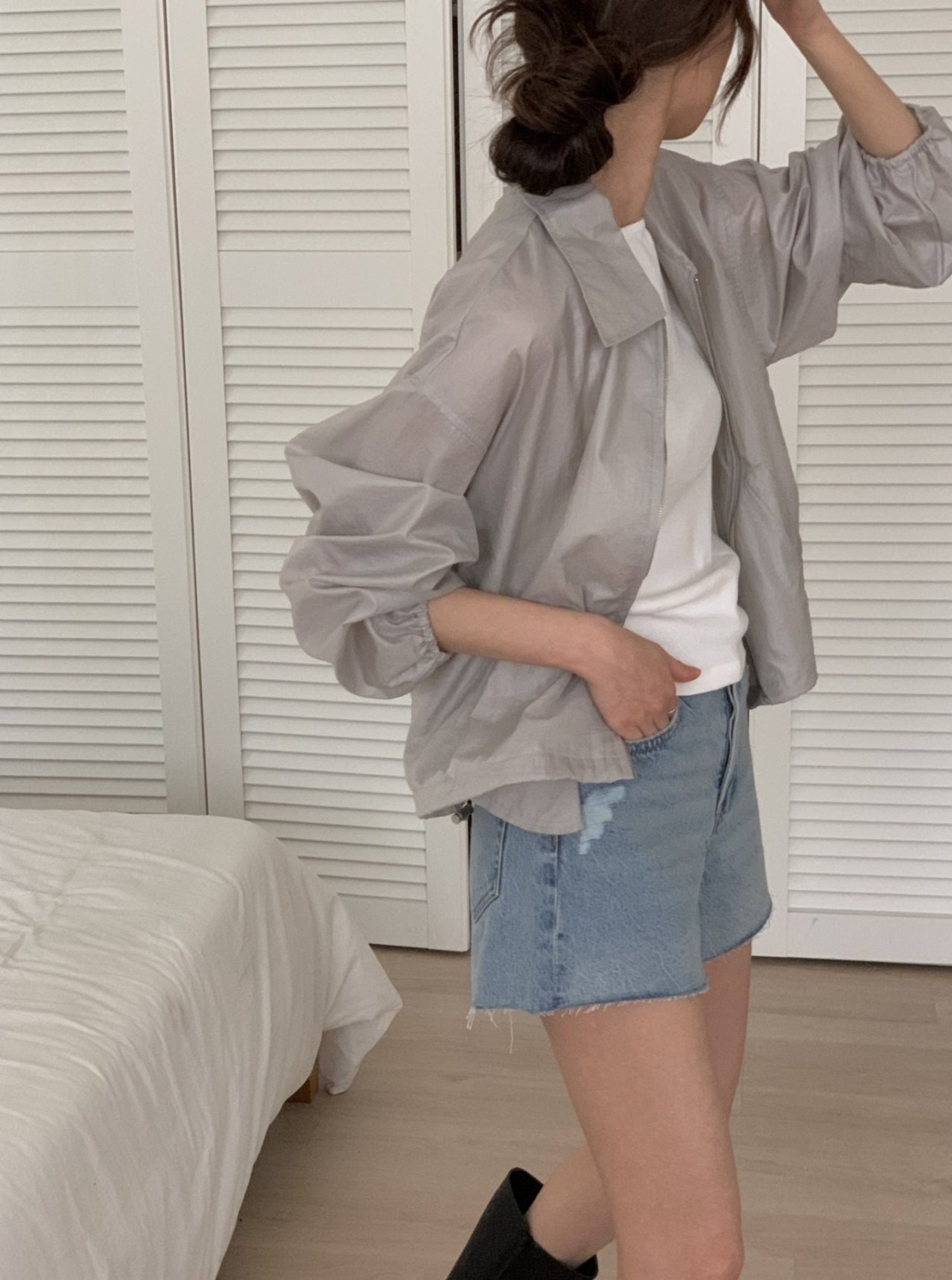 This jacket is featured in oversized, zipper with long sleeve.