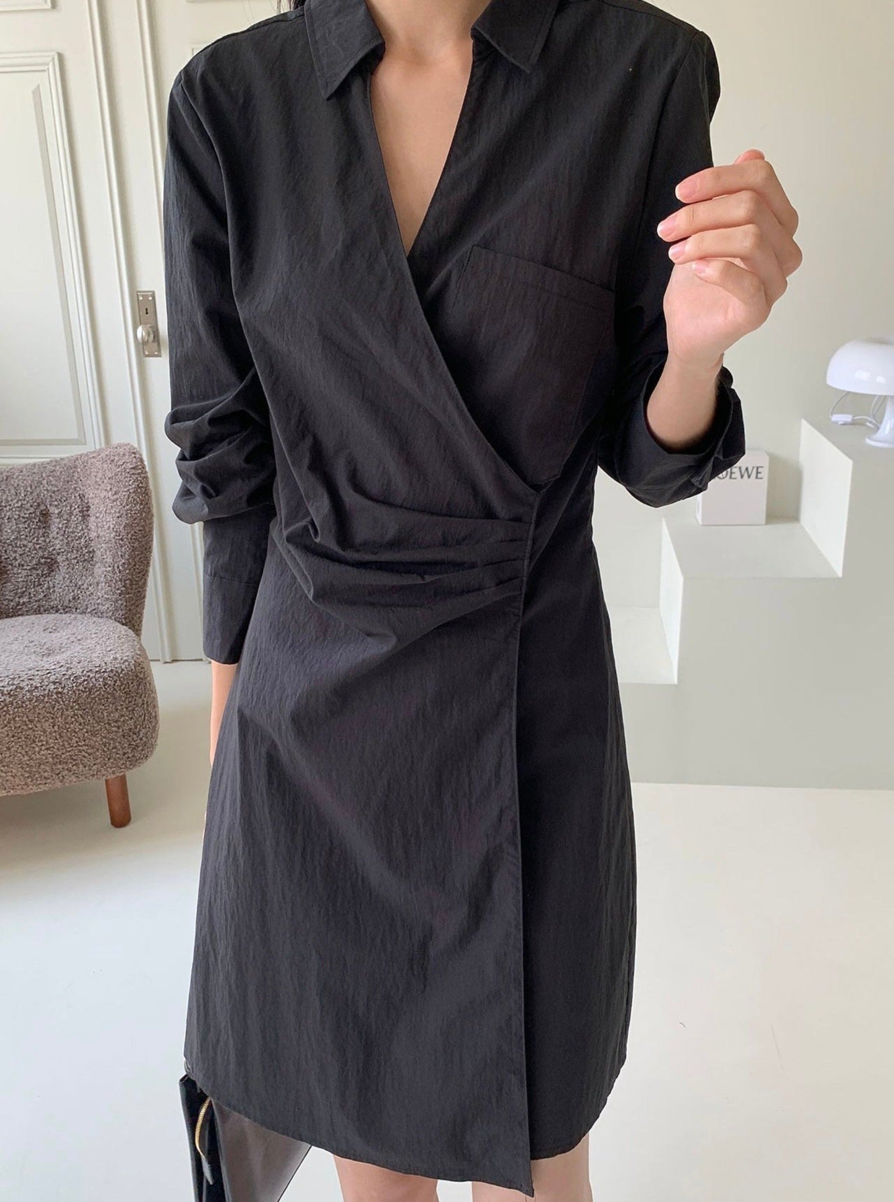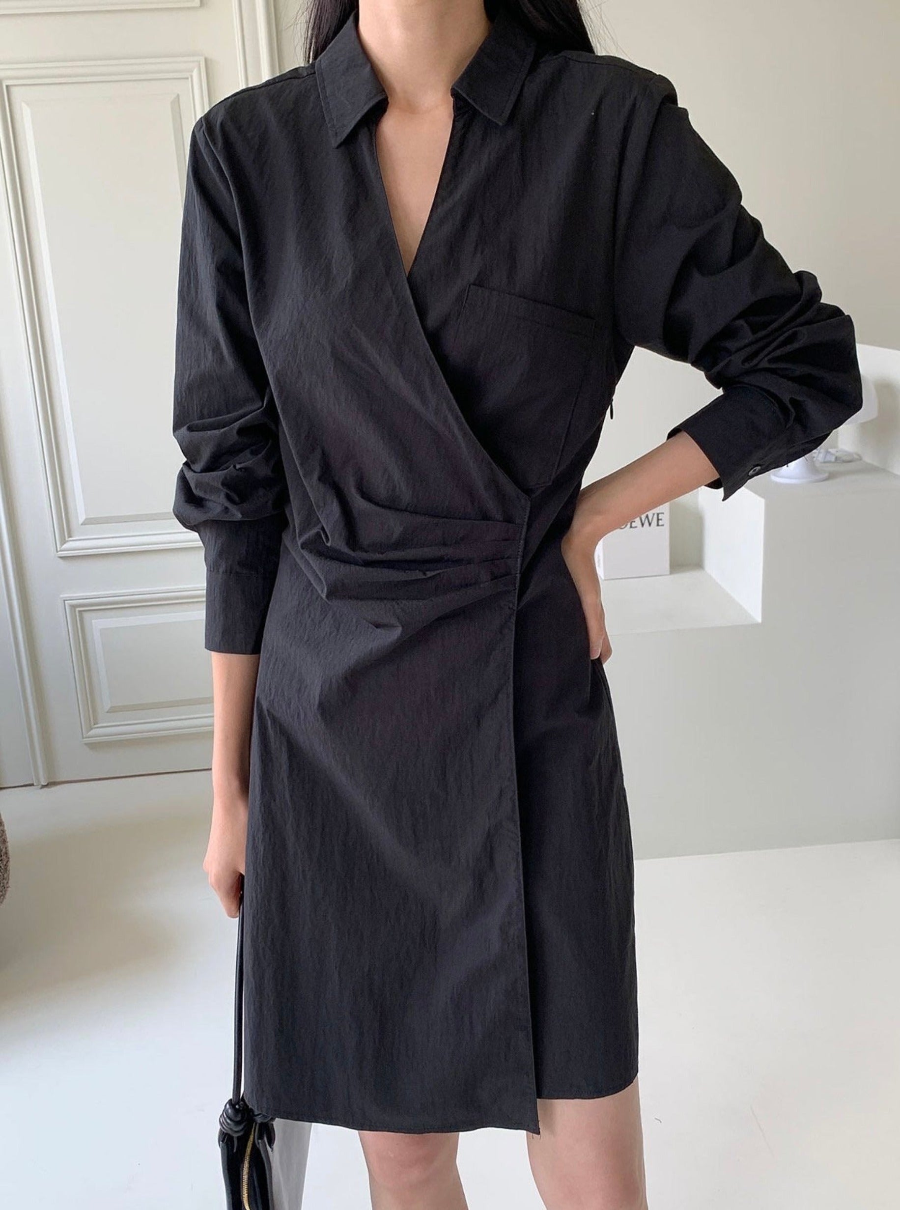 This shirt dress is featured in a collar neck, long sleeve with side pleats.